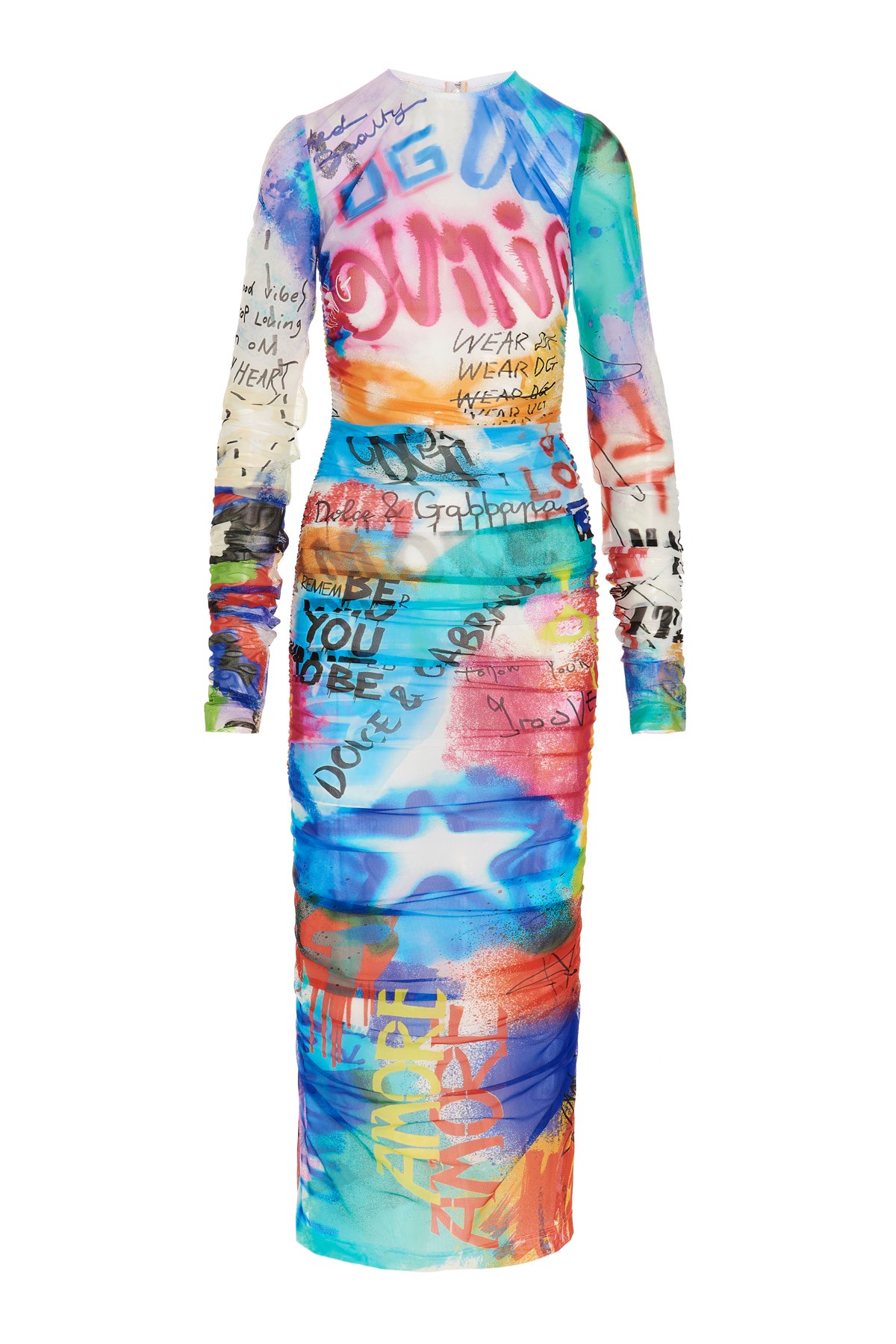 From the brand’s Fall/Winter 2021 collection, the $2,845 Dolce and Gabbana graffiti print midi dress appears in semi-sheer material which hugs the body with its allover 90s-inspired graffiti-style artwork. The dress consists of long sleeves and slight ruching to further accentuate the figure of the wearer. With such a stylish piece, it is no wonder celebrities like Nicki Minaj and Kris Jenner are fans of the piece.
