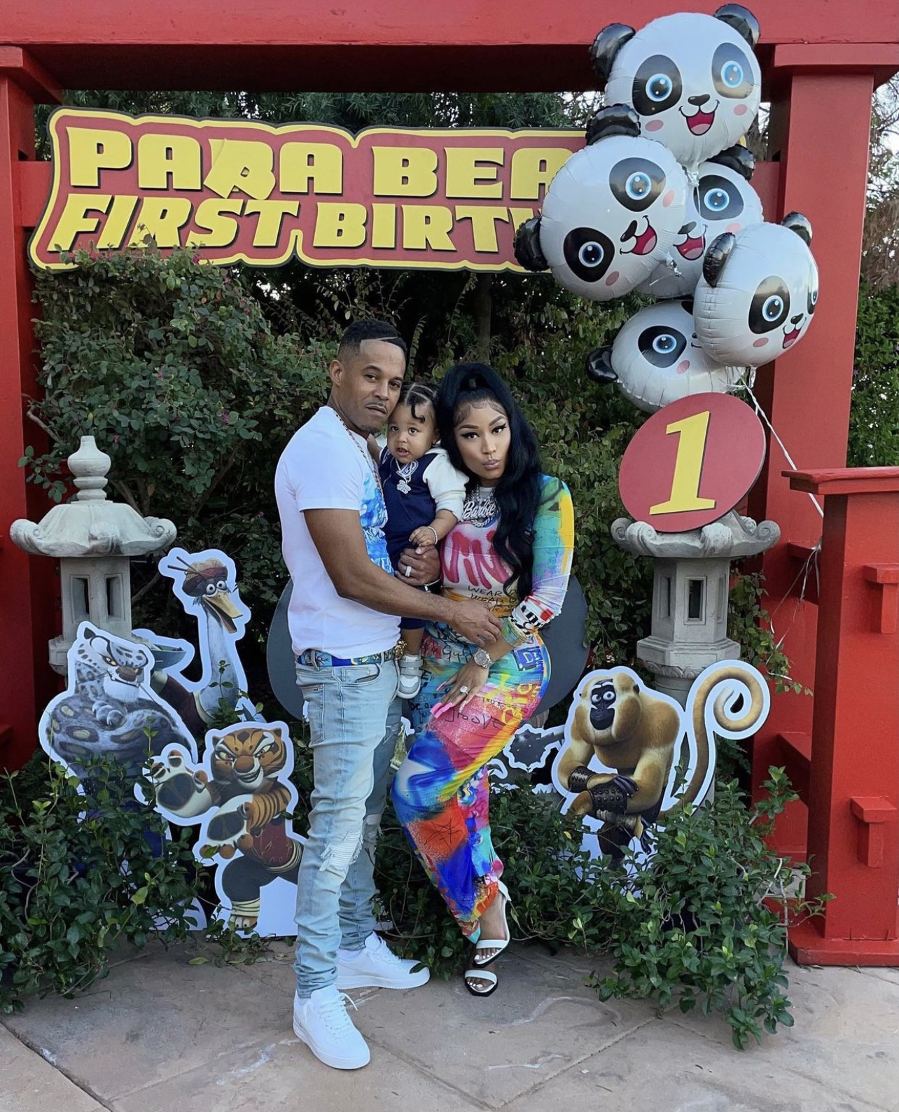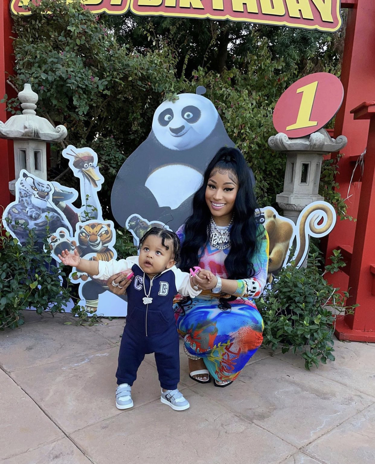 Nicki Minaj wore the $2,845 Dolce and Gabbana graffiti print midi dress while celebrating her son’s first birthday with husband Kenneth Petty. She paired the look with a white heeled sandals and icy jewelry pieces including her signature Barbie necklace. The rapper also went with a high ponytail for her hairstyle of choice.