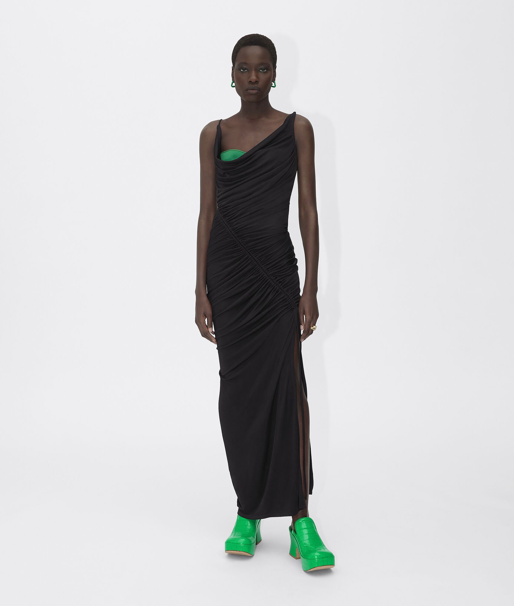 From Bottega Veneta’s Pre-Fall 2021 collection, the $3,450 viscose jersey dress takes on the appearance of an elegant black sleeveless maxi dress with a twist of a contrasting green top peeking out ever so slightly. The dress consists of ruched and draped detailing in addition to a side slit which can be adjusted.