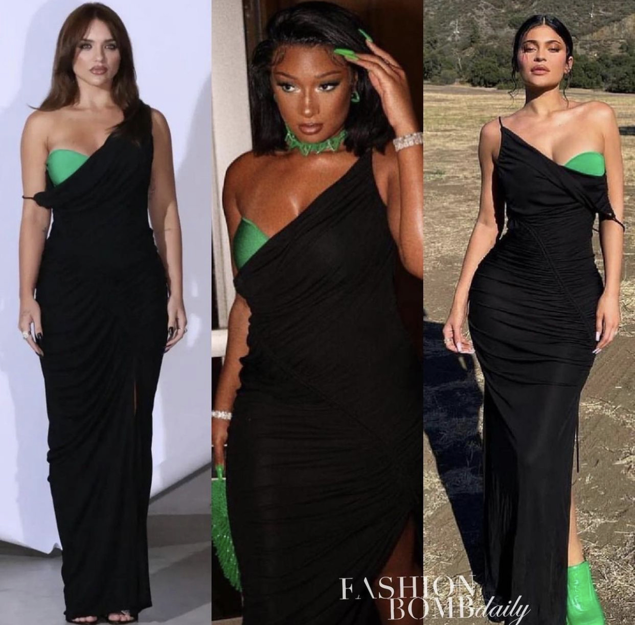 Rapper Megan Thee Stallion, model-entrepreneur Kylie Jenner, and Brazilian influencer Rafa Kalimann were all spotted in the same Bottega Veneta dress.