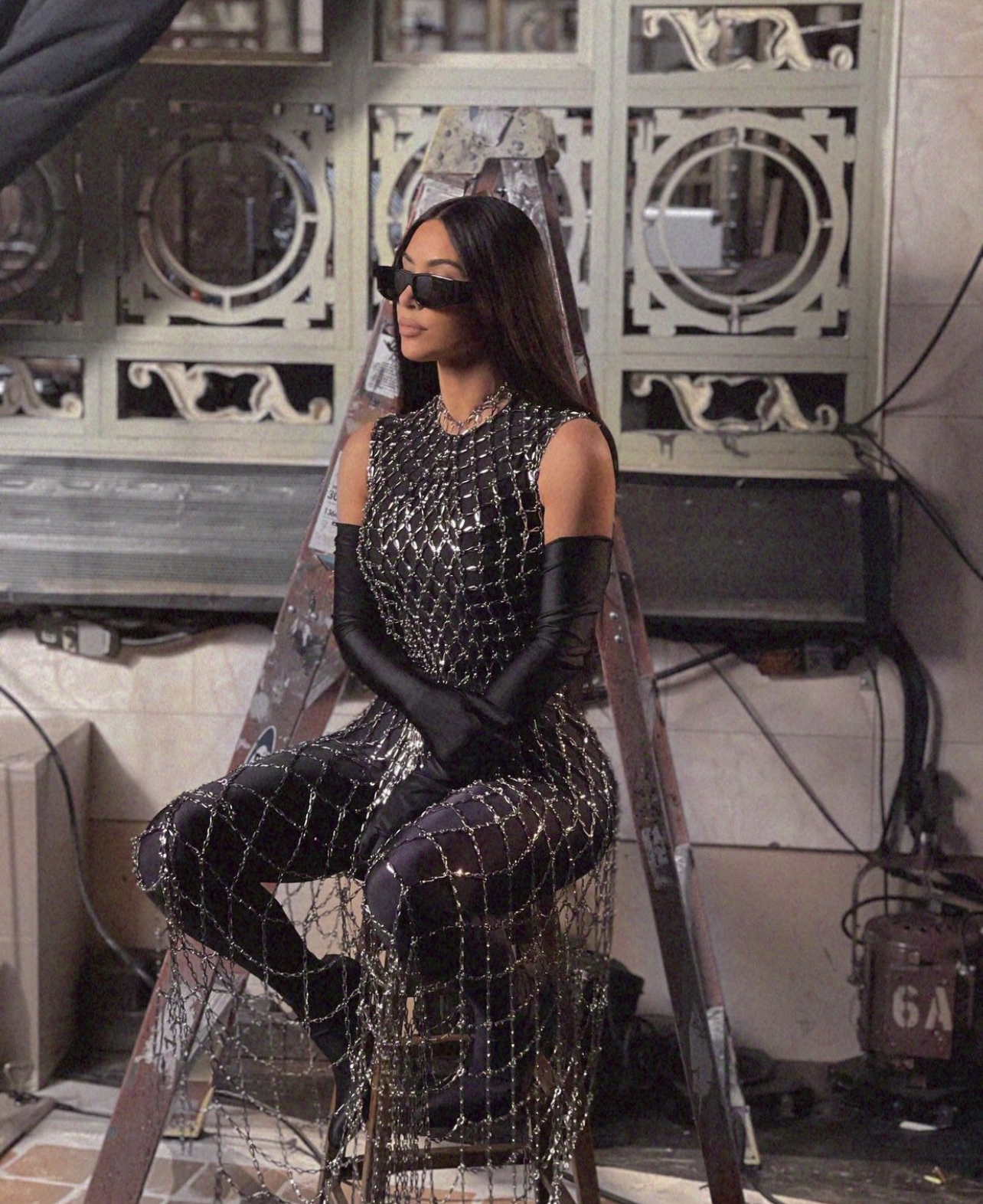 Kim Kardashian wore a Balenciaga Spring 2021 RTW look which included a black pantashoe jumpsuit with a chain dress overlay. Kim also wore black sunglasses straight from the look as well. Finishing the ensemble, she opted for black gloves by Balenciaga as well.