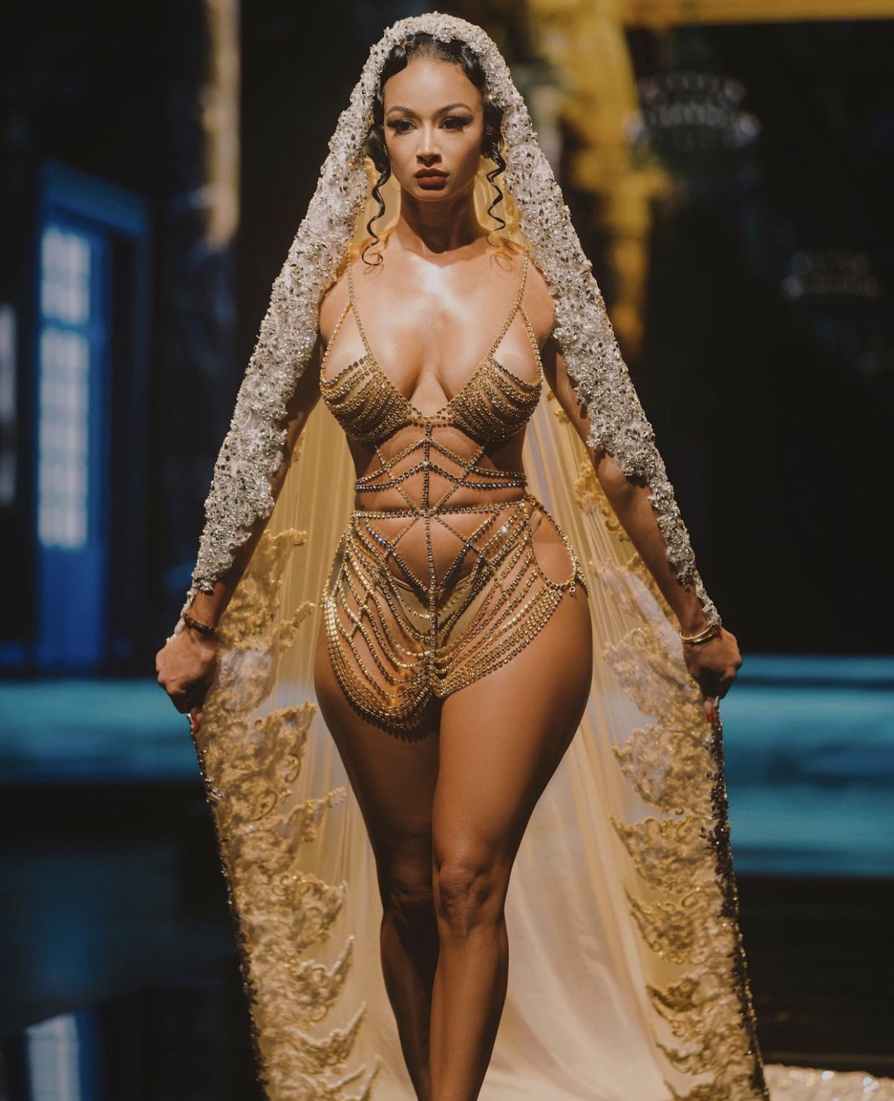 Draya Michele snagged the number one spot for the most engaged look of the week! The model walked the Lace By Tanaya x Nicole Lynel show this week wearing a dazzling ensemble from the collaborative collection. Making up her shimmering look, she wore a two-toned crystal romper and crystal veil.