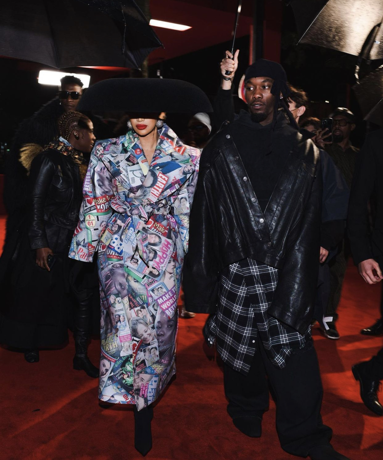 Cardi B and Offset shut down the Balenciaga Summer 2022 red carpet-runway wearing looks by the label. Styled by Kollin Carter, Cardi B wore the brand’s Spring 2020 tabloid trench coat paired with a Fall 2021 Couture black hat, gloves, sock boots, and earrings. Offset was outfitted in a look from the Summer 2022 collection as he was one of the show’s models.