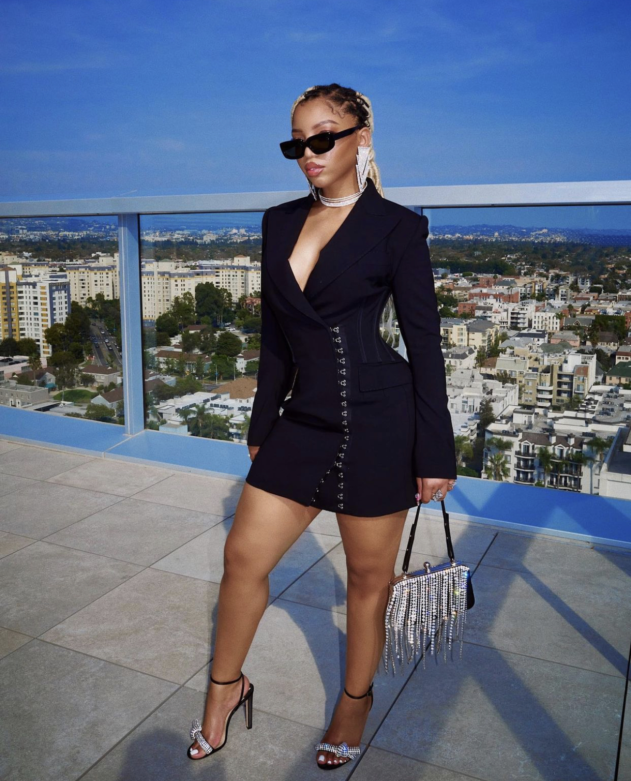 For her appearance, Chloe kept it classy and stylish in a blazer dress look. She wore a $1,145 Dolce and Gabbana corset blazer jacket (sold out) paired with $1,525 Jimmy Choo Thyra black suede sandals with pavé crystal cord detail. She also went with black sunglasses and Alessandra Rich jewelry pieces including their crystal triangle drop earrings. Her look was styled by KJ Moody.