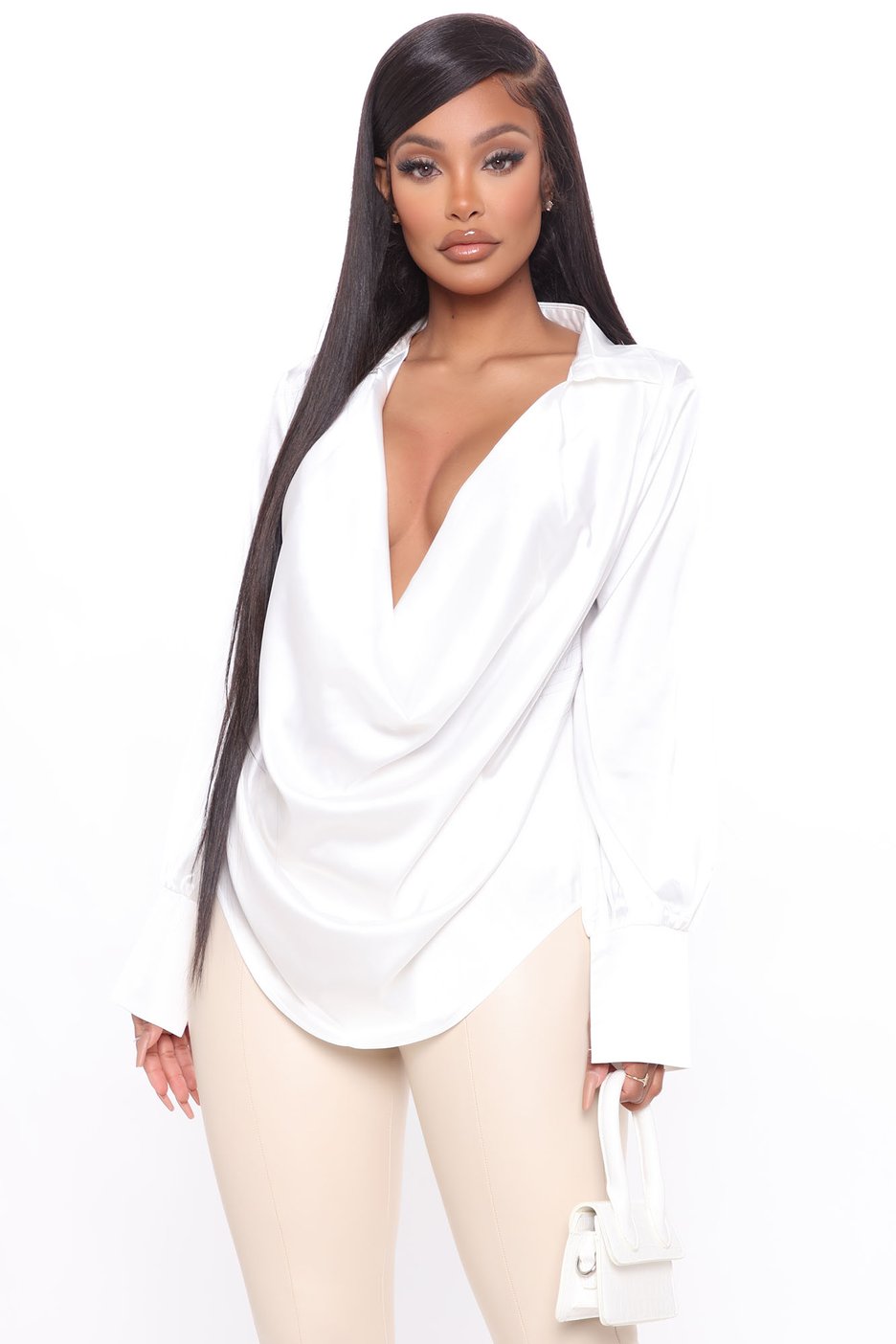 The Touch By Touch Satin Top appears with long sleeves and a plunging cowl neckline in a silky smooth satin material. Additionally, it is offered in white, black, and hunter green. Perfect a night out, the top can be paired with your favorite mini skirt or jeans for a bomb look!