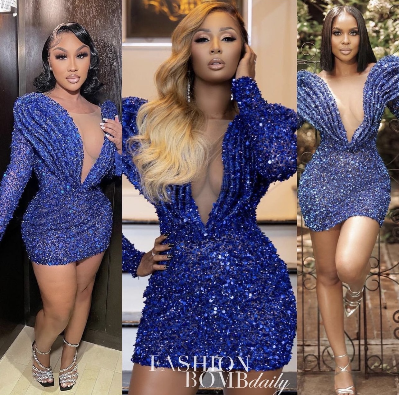 The It Girl online boutique founder Ariel posed in the featured blue sequin dress, accessorizing it with silver strappy heeled sandals. She wore her hair in a sleek bob style.