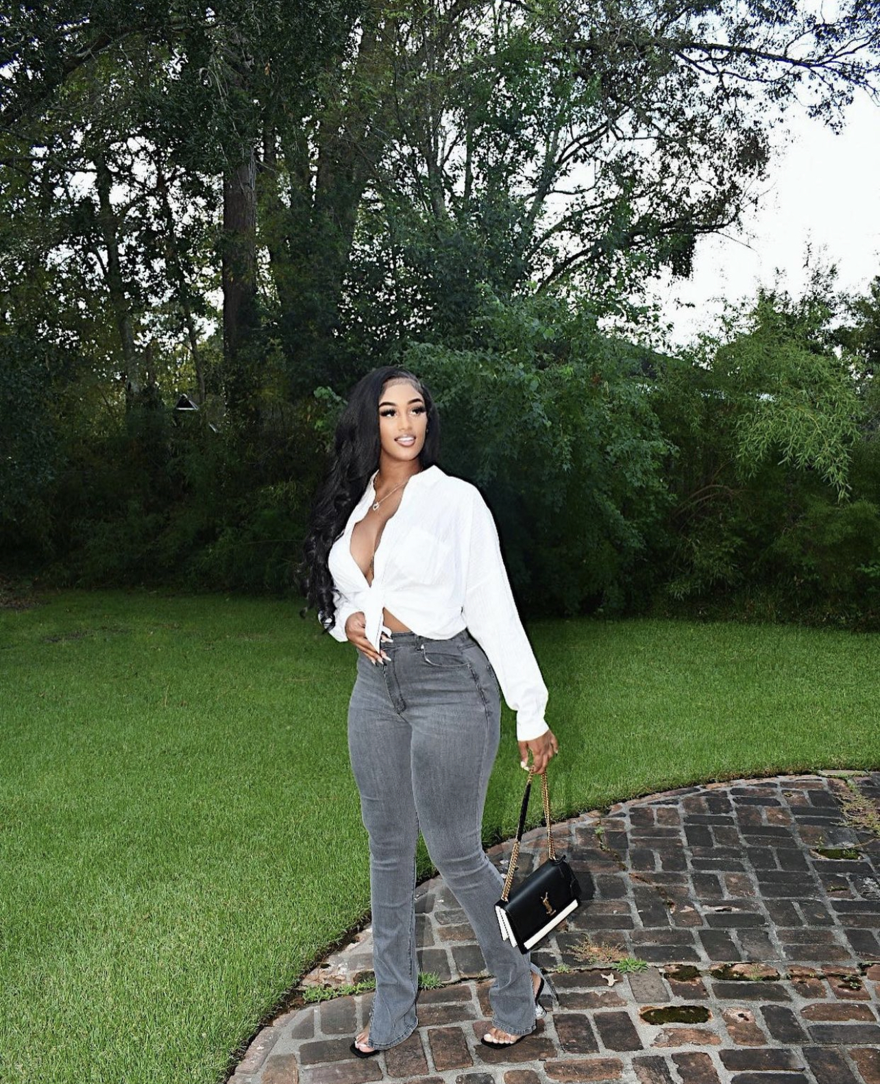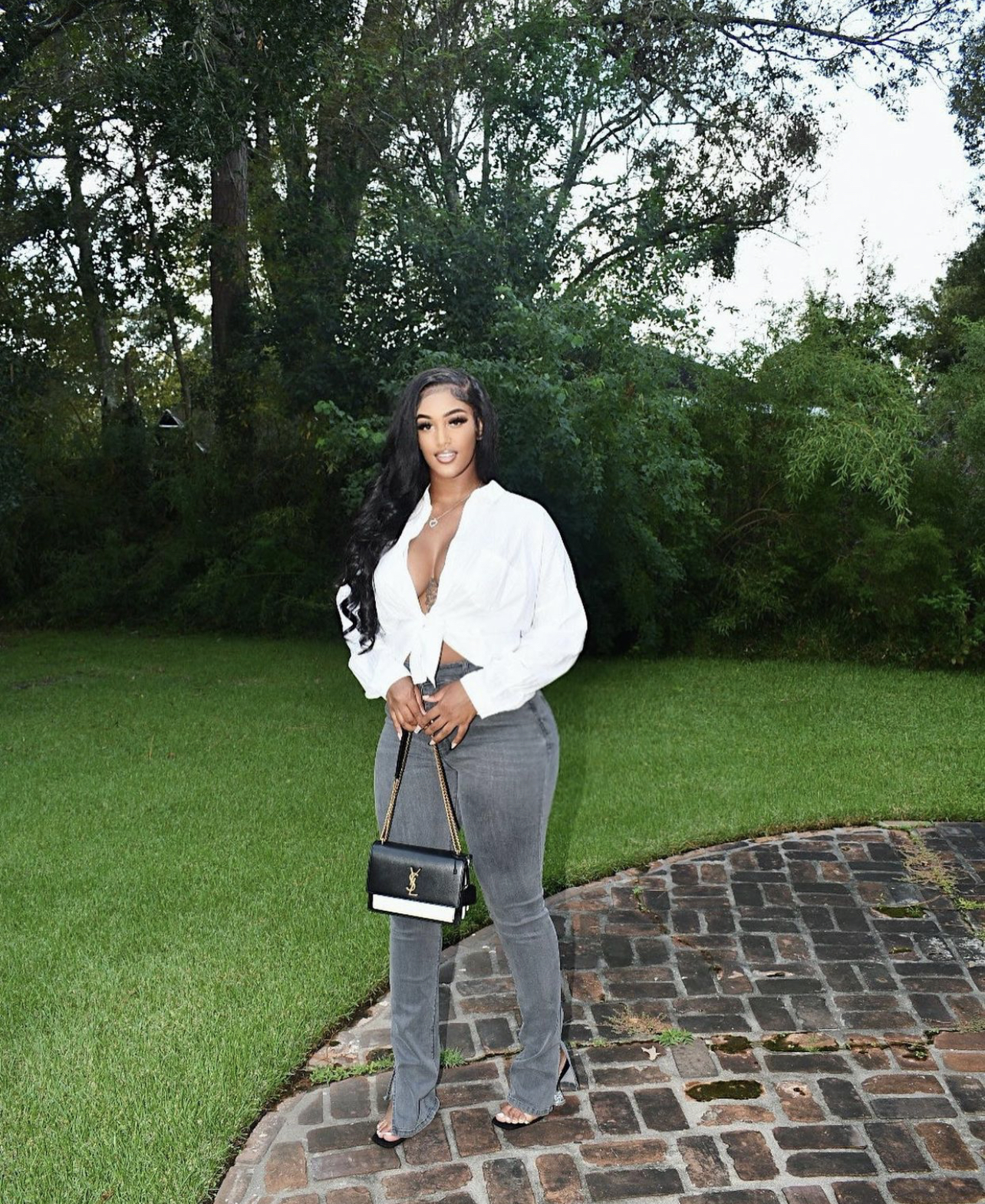 Nique wore the Fashion Nova $39.99 Soho Side Split Skinny Jeans in grey. She paired the jeans with a white striped tie-front top and black PVC strap heels. For accessories, she went with a Saint Laurent black and white handbag and pendant necklace.