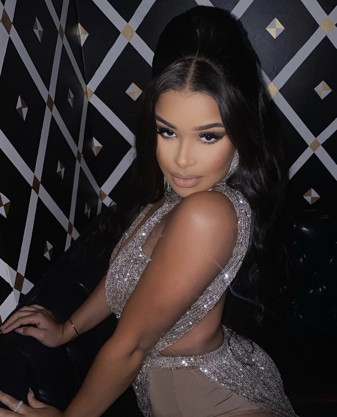 Taina Williams wore Fashion Nova’s $69.99 Chantel Sequin Maxi Dress in brown. She accessorized the shimmery dress with other sparkly pieces such as crystal drop earrings, rings, and nude PVC sandals. For hair, she went with a bumped wavy style.