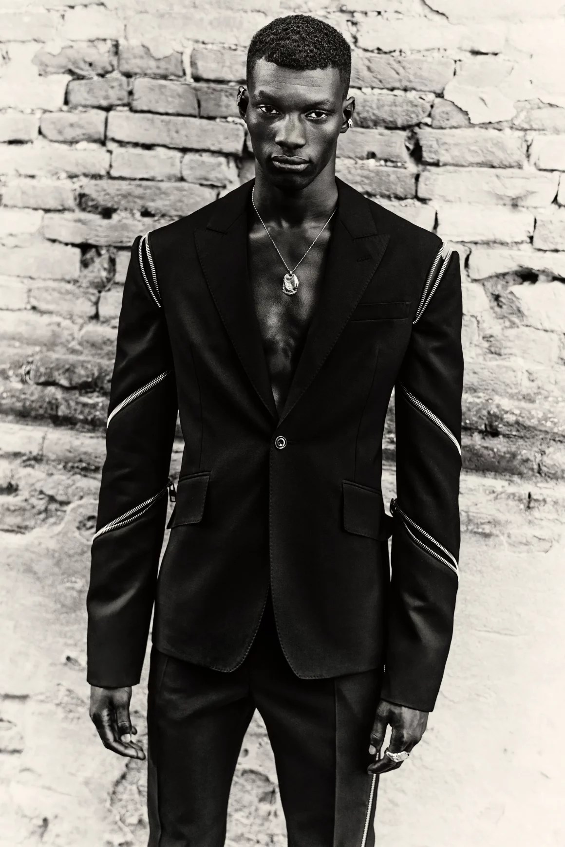 Timothée Chalamet wore an Alexander McQueen Spring 2022 suit for the film’s exclusive London screening. His look included a single-breasted jacket and trousers with zip details throughout each piece. He completed the look with black boots and a necklace.