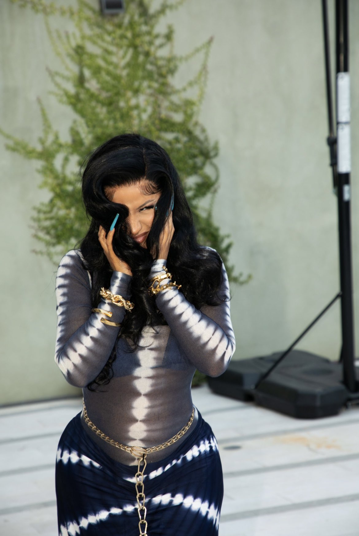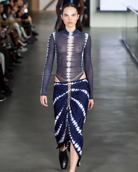 Cardi B wore a Dion Lee Fall 2020 tie-dye look including a mesh long sleeve bodysuit and chain-detail maxi skirt. The tie-dye pieces were paired with Dylan Lex jewelry pieces and Balenciaga white lace-up heels. Her look was styled by Kollin Carter.