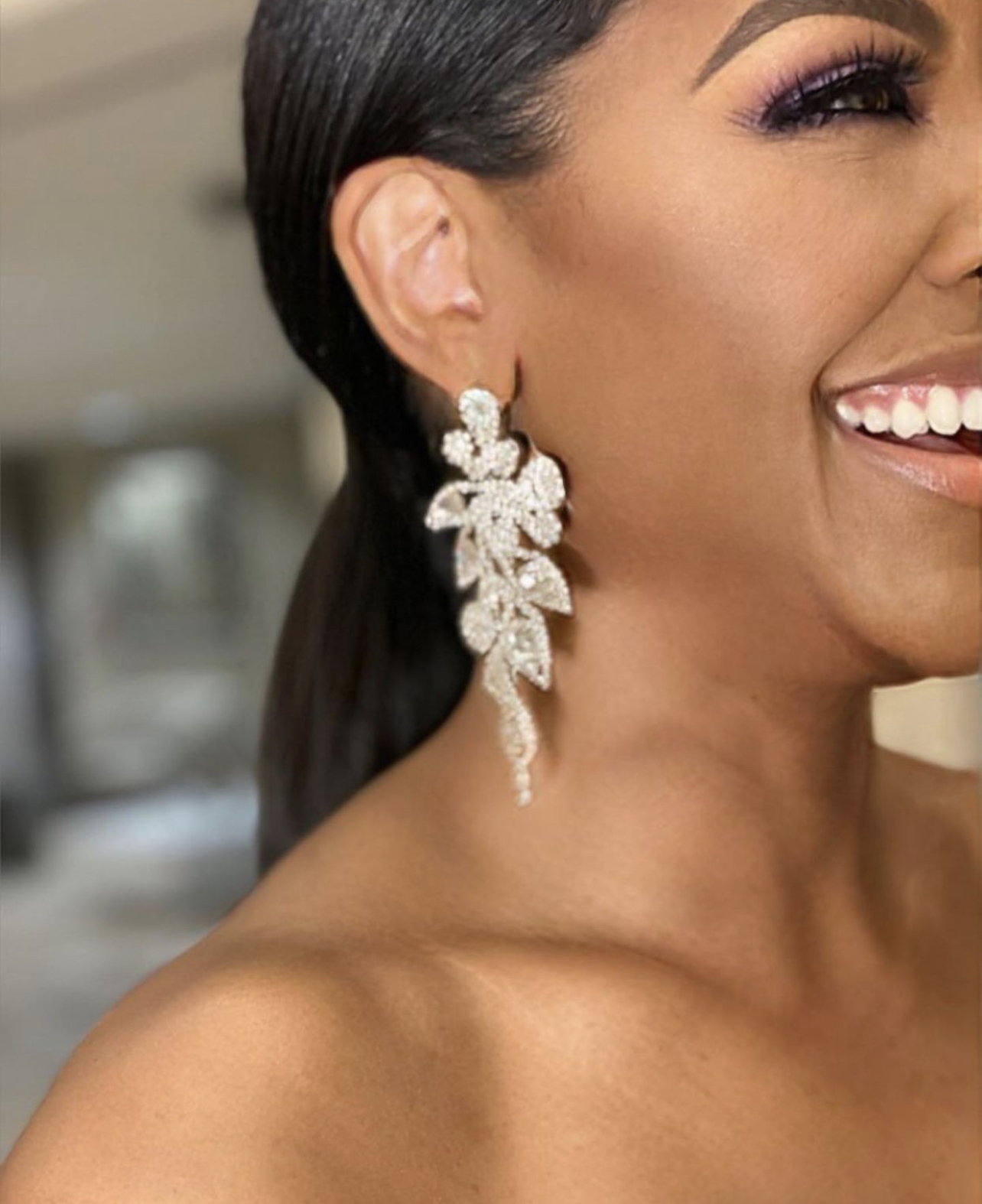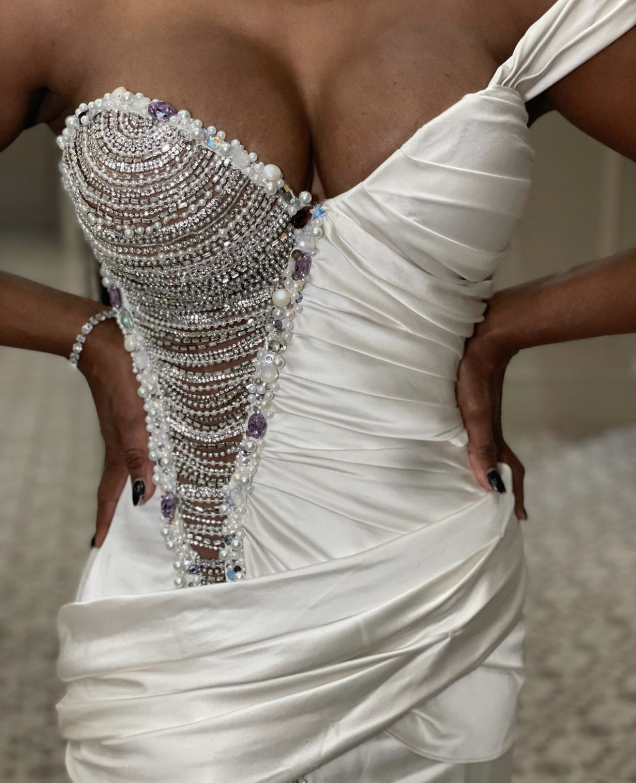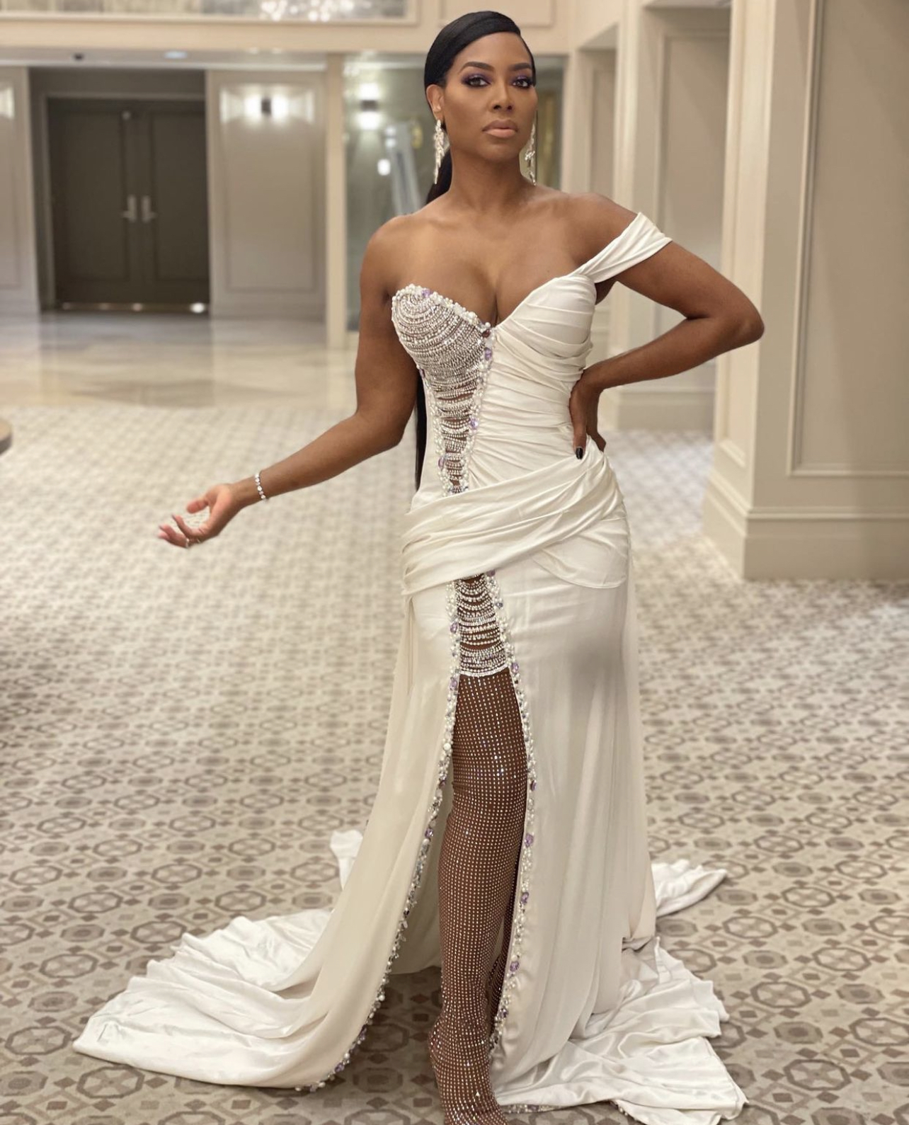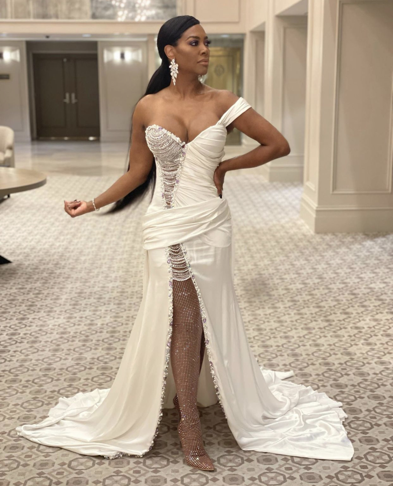 Kenya Moore was spotted filming for the upcoming season of Real Housewives of Atlanta wearing a dress by Linda Stokes Designs. Her dress stuns in white satin with a single shoulder strap, crystal and pearl embellishments, and elegant draping.