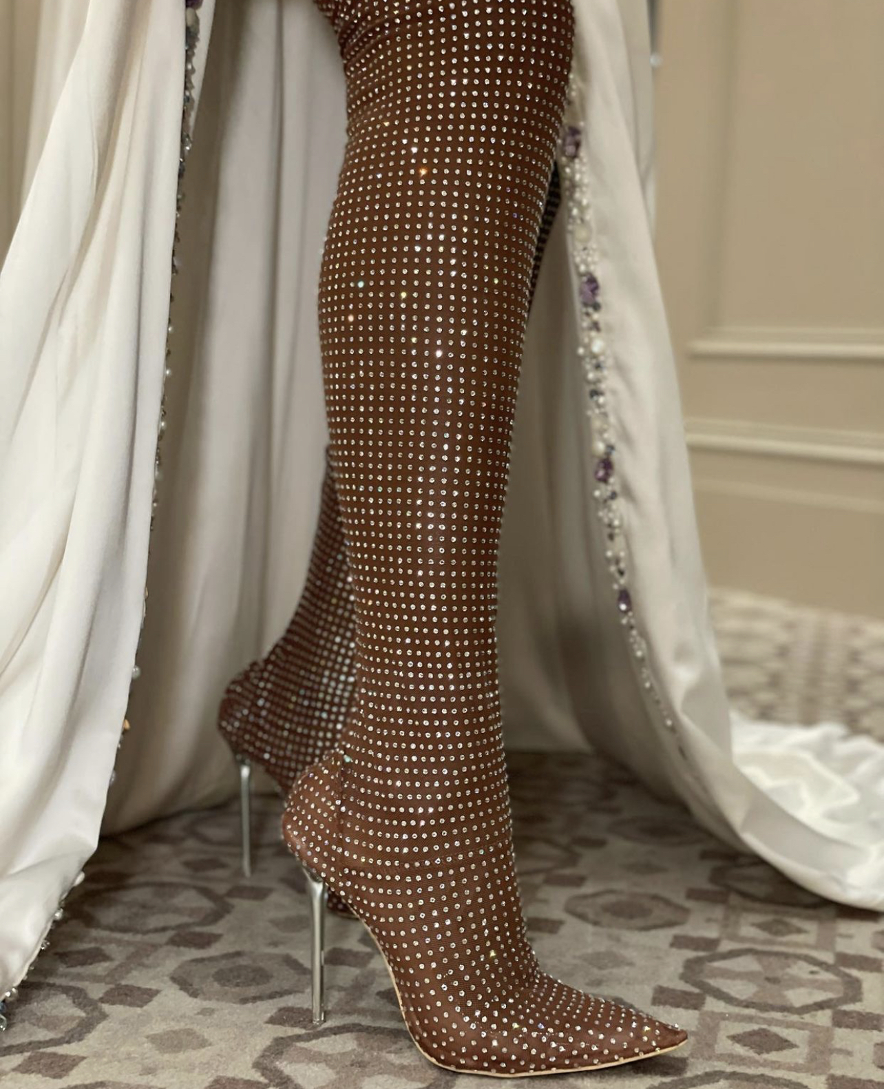 The look was coordinated with crystal-adorned over-the-knee boots and drop earrings. Kenya opted for a ponytail to go along with her elegant gown.