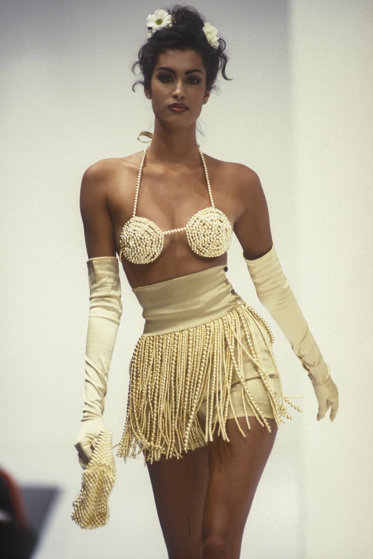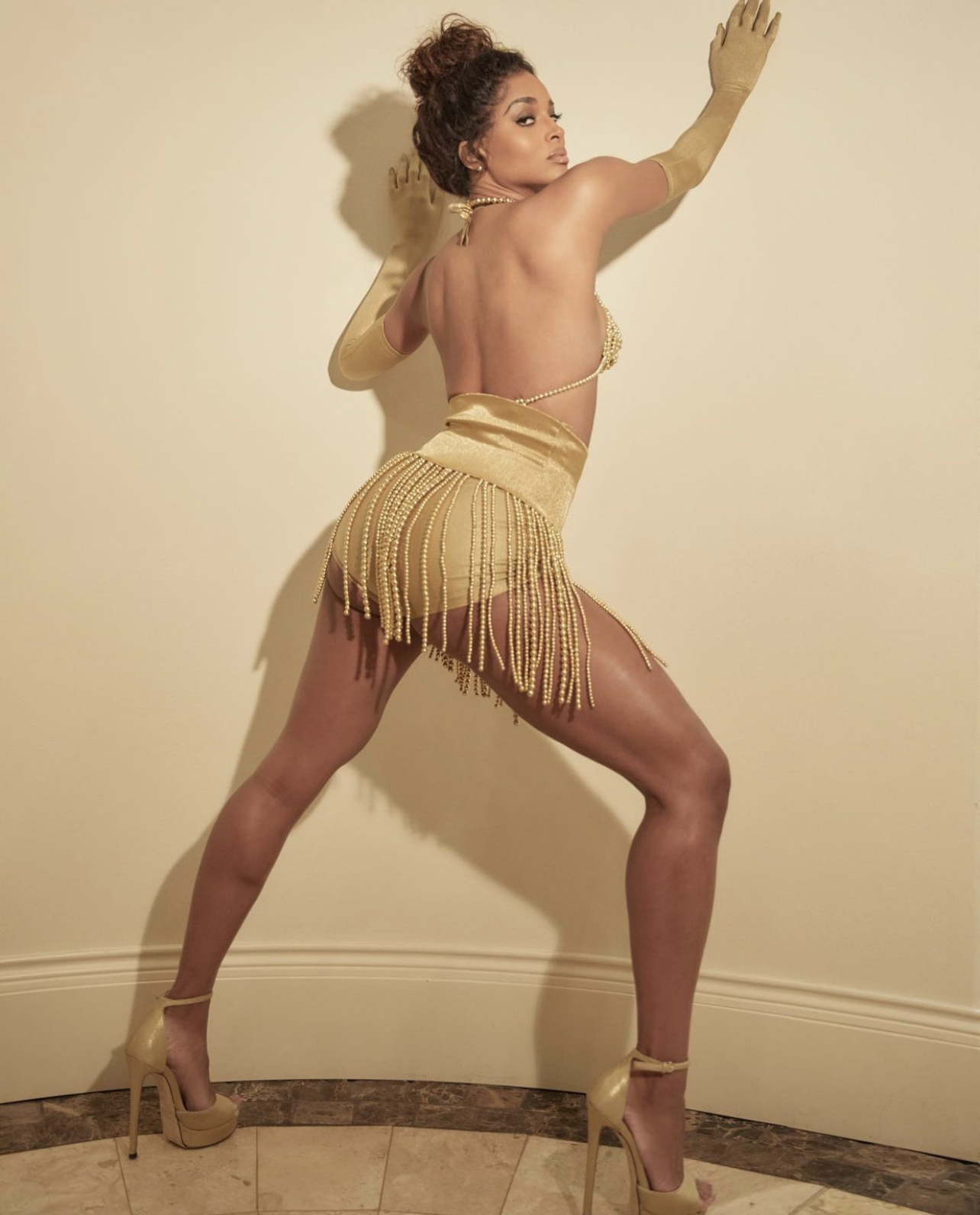 Ciara posed in a Dolce and Gabbana Spring/Summer 1992 look which featured a beaded bralette, tassel shorts, handbag, gloves, and platform heels in a dazzling gold hue. This same look was worn down the brand’s runway by Yasmeen Ghauri. Ciara even rocked flowers in her hair like Ghauri did for the SS92 runway show. Accompanying the Dolce and Gabbana look, she also wore the Glaucus necklace by Paula Mendoza. Her ensemble was styled by Kollin Carter.