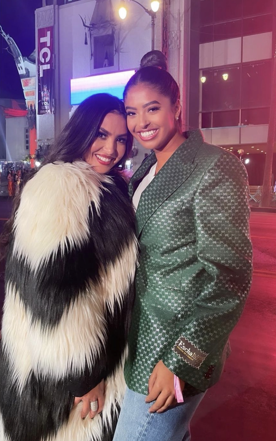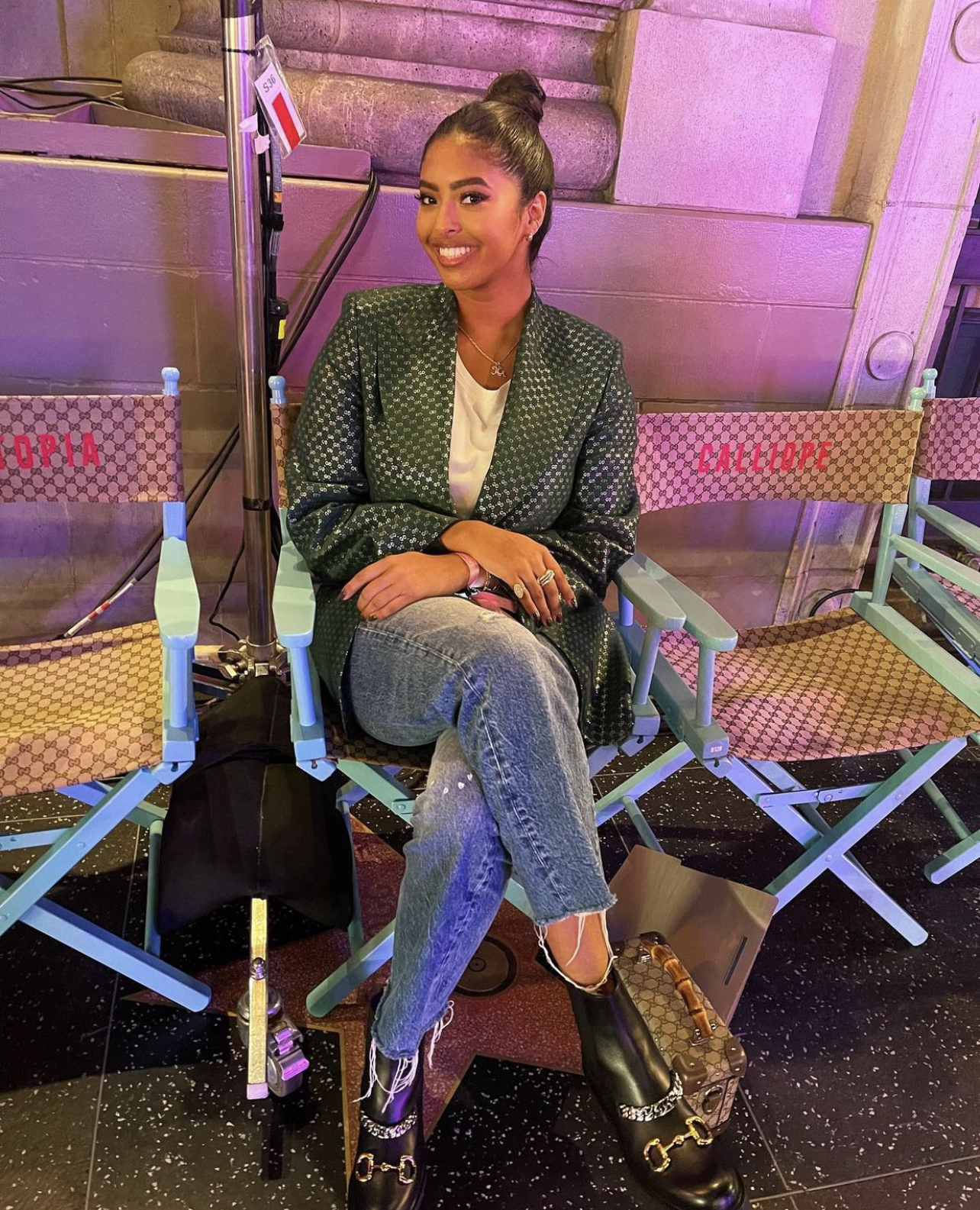 Vanessa Bryant was joined by daughter Natalia Bryant at the Gucci Love Parade. Vanessa wore the Gucci Geometric intarsia faux fur coat with a black sparkly monogram dress. Natalia wore the brand’s $4,200 GG lurex blazer in Green with a white top, jeans, and chain-detail black boots.