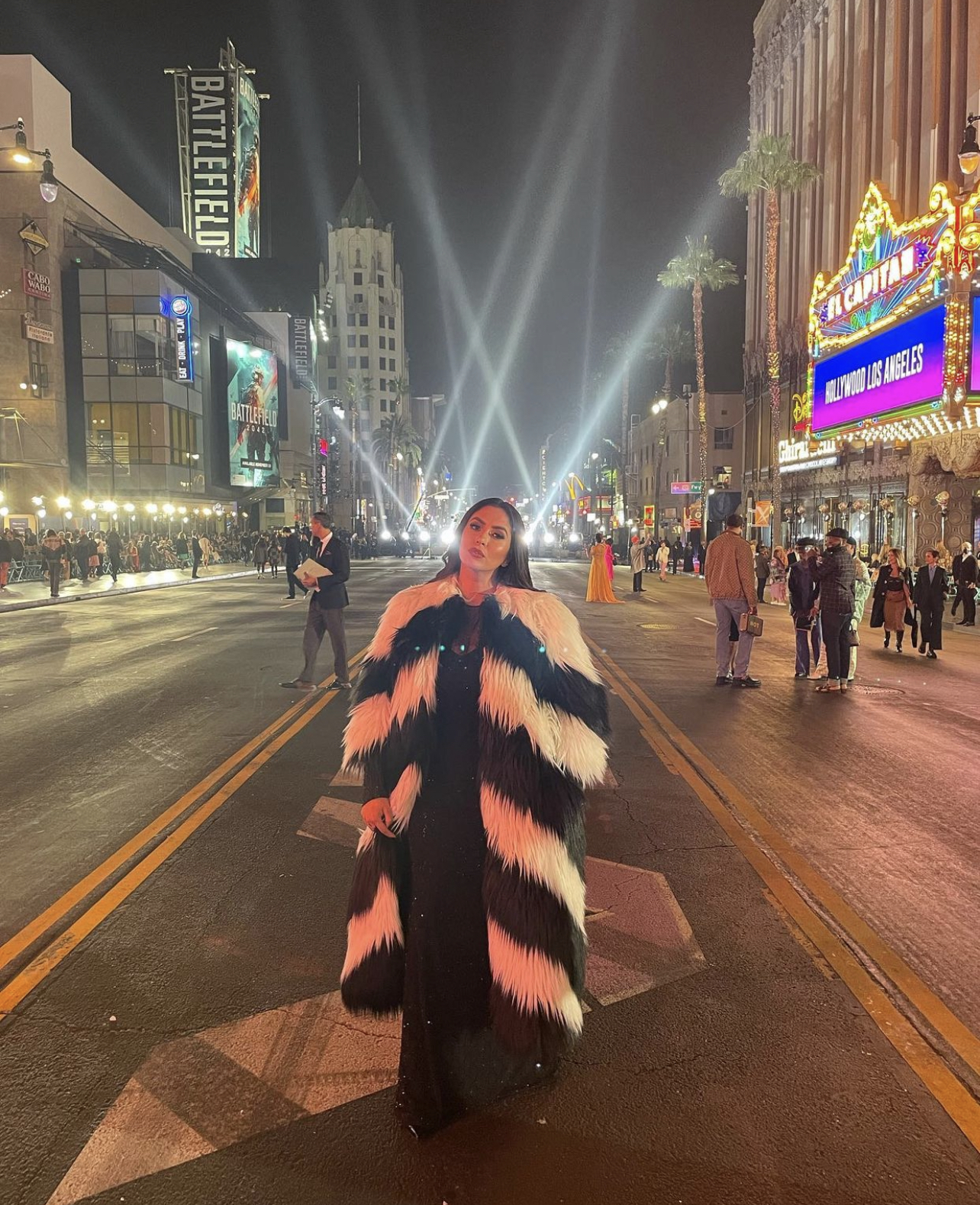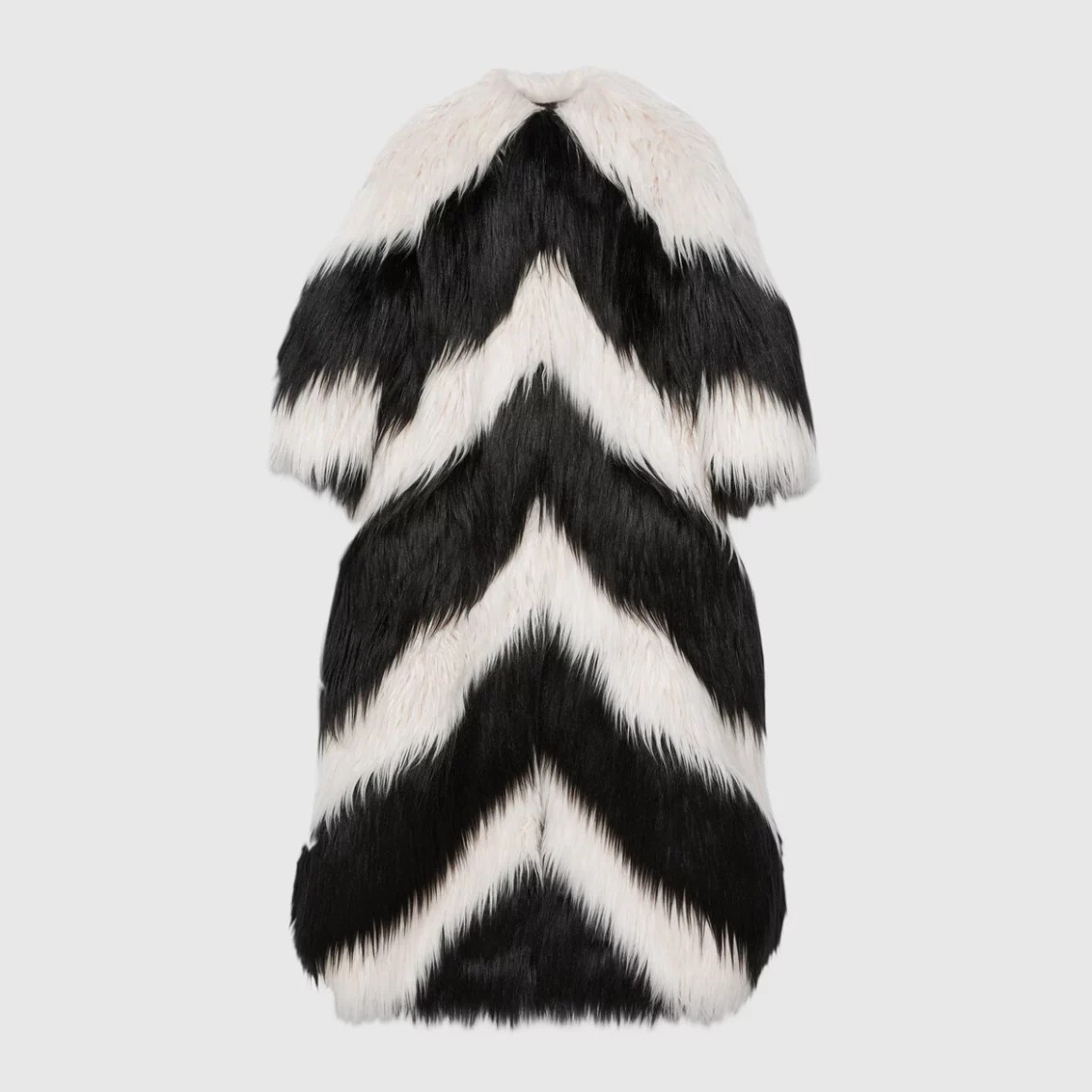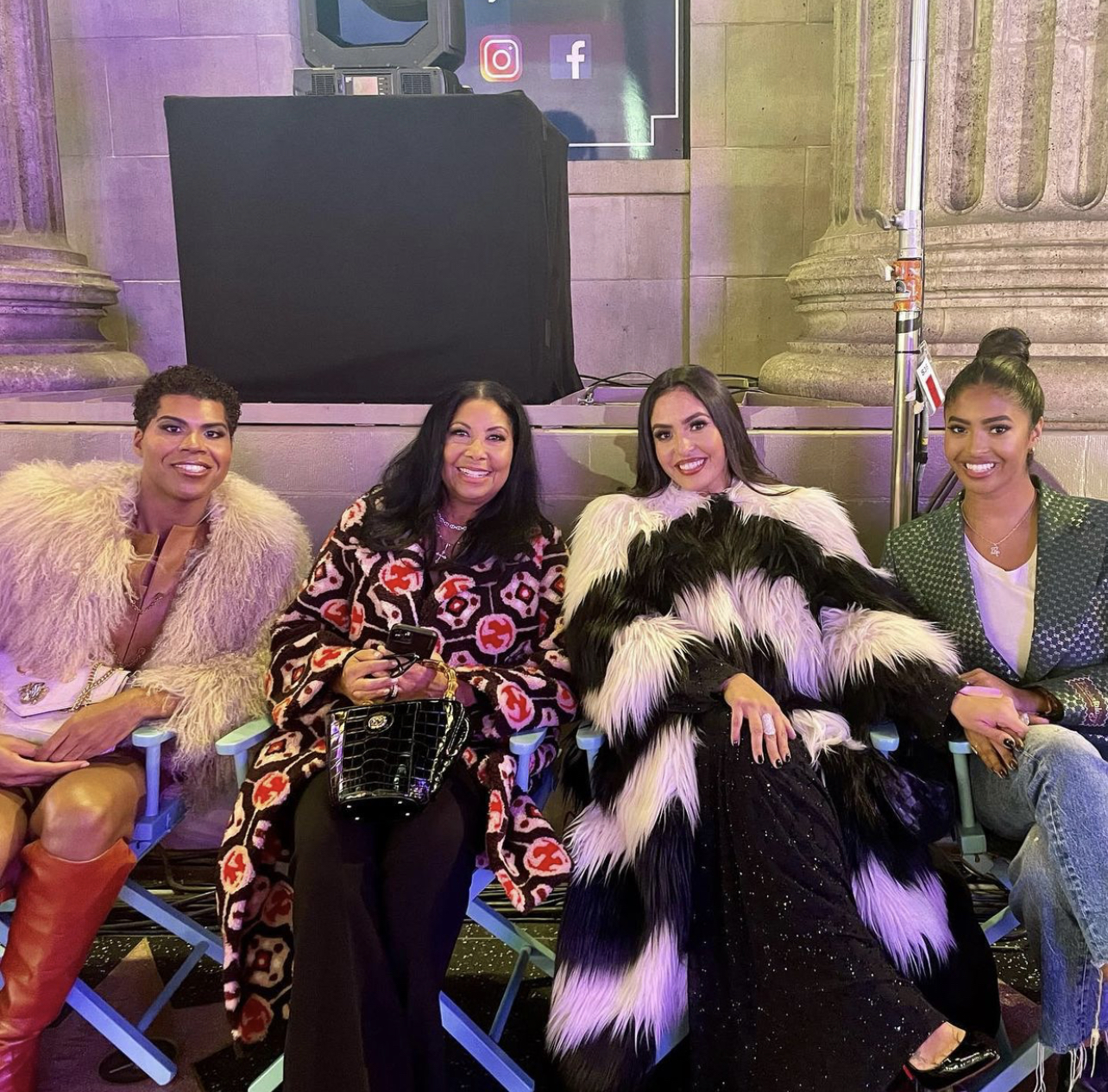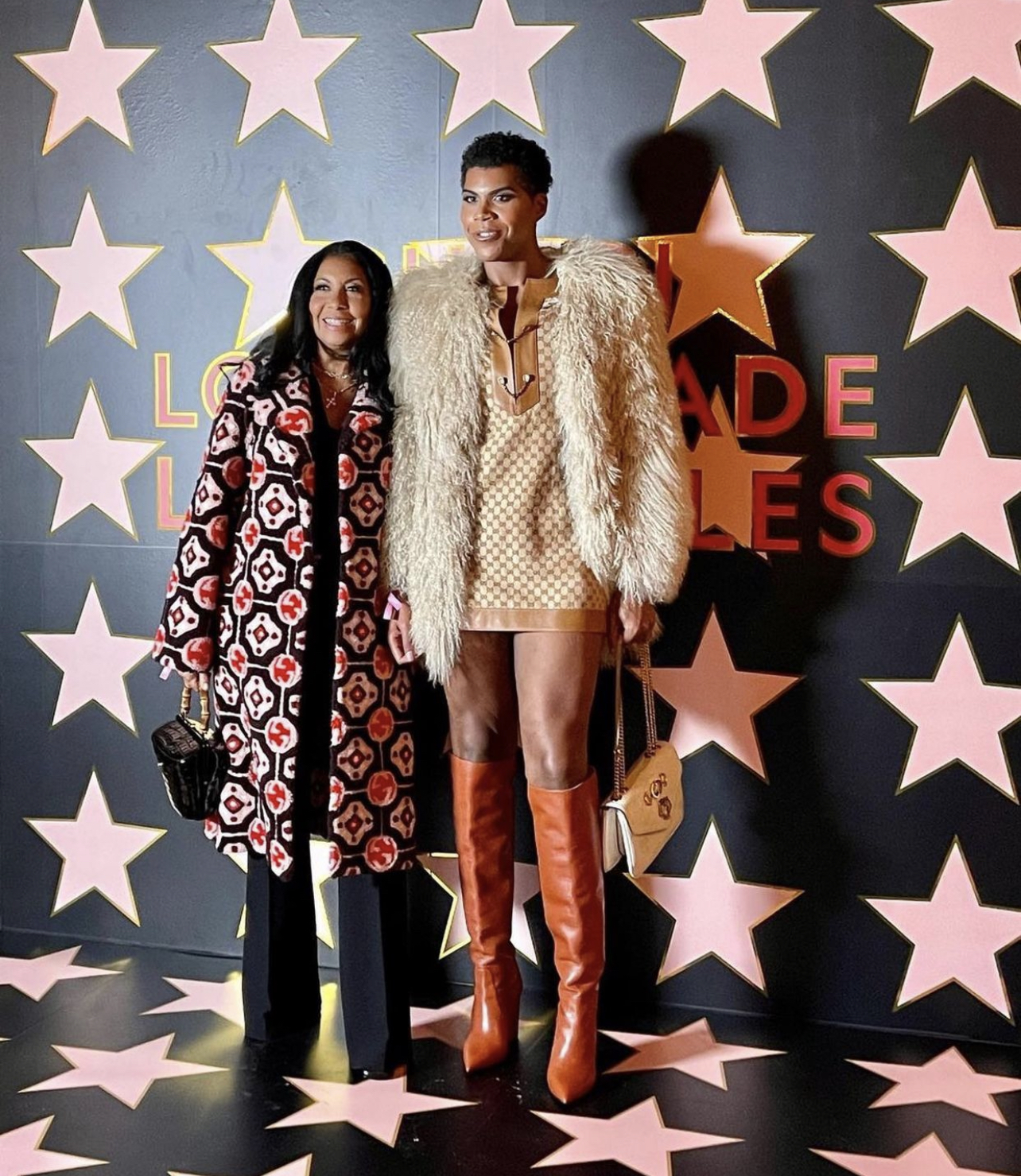 EJ Johnson and Cookie Johnson were also on the scene in looks by the brand. EJ Johnson wore a shaggy fur jacket and $4,200 leather-trimmed GG-jacquard linen-blend dress paired with brown leather knee-high boots. Cookie wore a Resort 2021 GG-panel single-breasted shearling coat coordinated with a black top, pants, and a handbag.