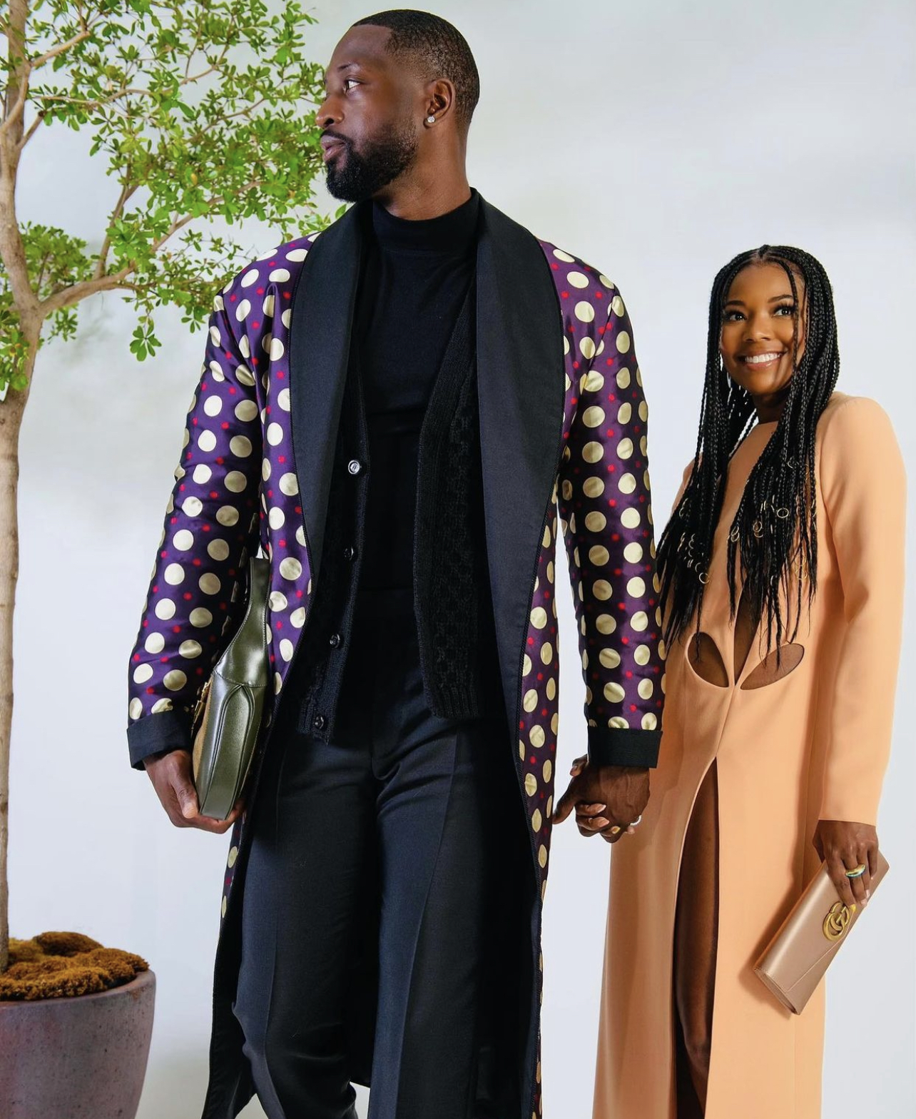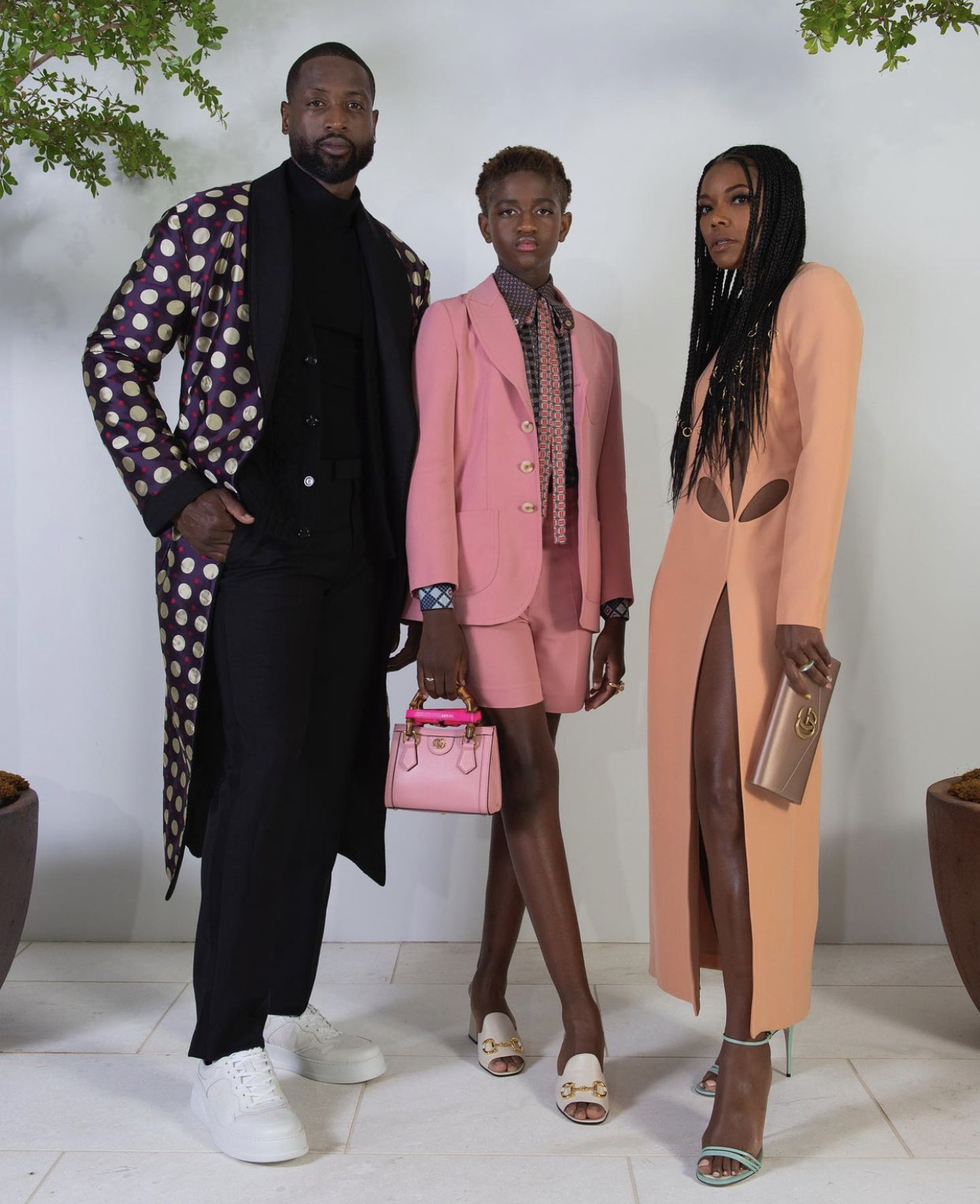 Dwyane Wade, Zaya Wade, and Gabrielle Union stepped on the scene wearing Gucci looks. Dwyane wore a polka dot coat matched with a black turtleneck, cardigan, and trousers. He finished the look with white sneakers.