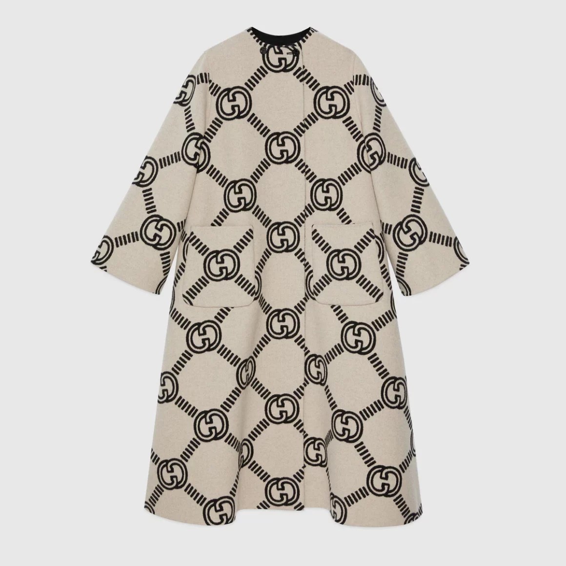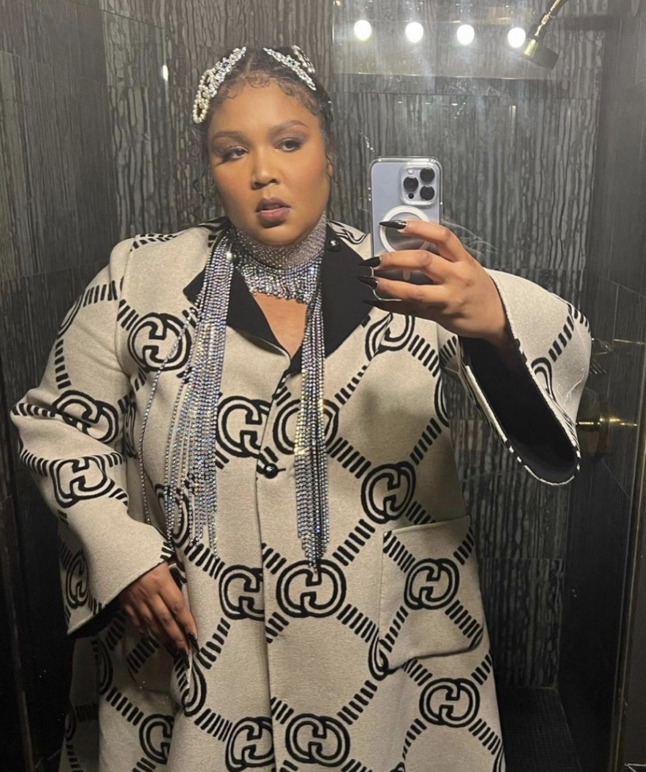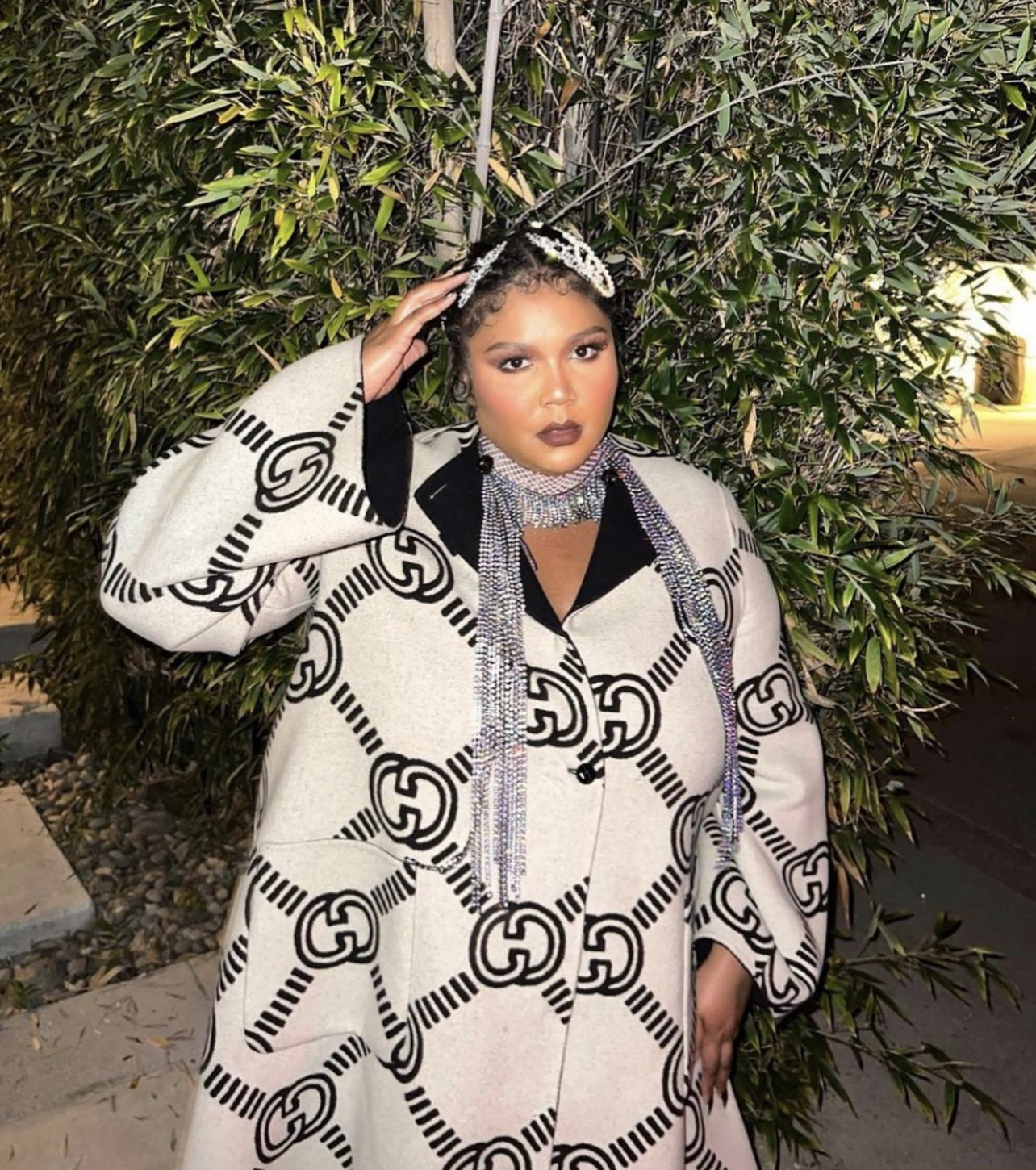Lizzo wore Gucci’s $5,200 Reversible maxi interlocking G coat paired with $2,750 “Diana” mini tote bag, and $850 monogram canvas slingback pumps. She also rocked crystal and pearl-embellished hair accessories along with a crystal fringe choker that extended to her chest. Her ensemble was styled by Jason Rembert.