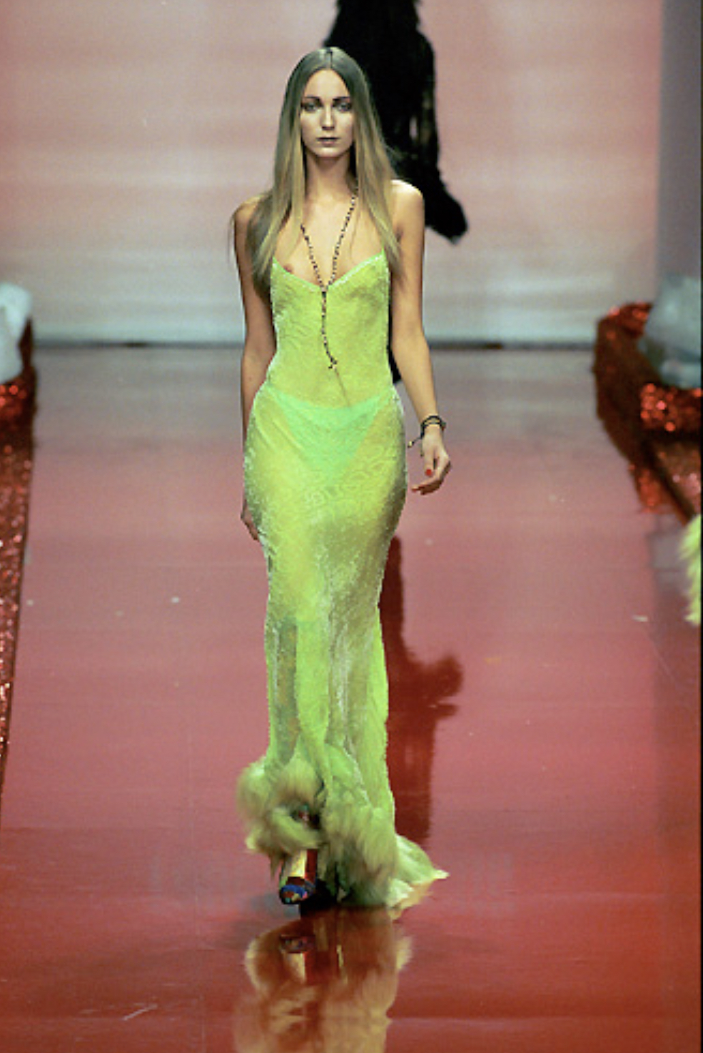 Lori Harvey wore a vintage Roberto Cavalli dress from the label’s Fall/Winter 1999 collection. The bright green dress appears with spaghetti straps in a smooth animal print velvet-like material, rounding off with a fur trim on the hem of the garment. The dress is paired with Candy Ice Lemon drop earrings. Harvey’s look was styled by Maeve Reilly.
