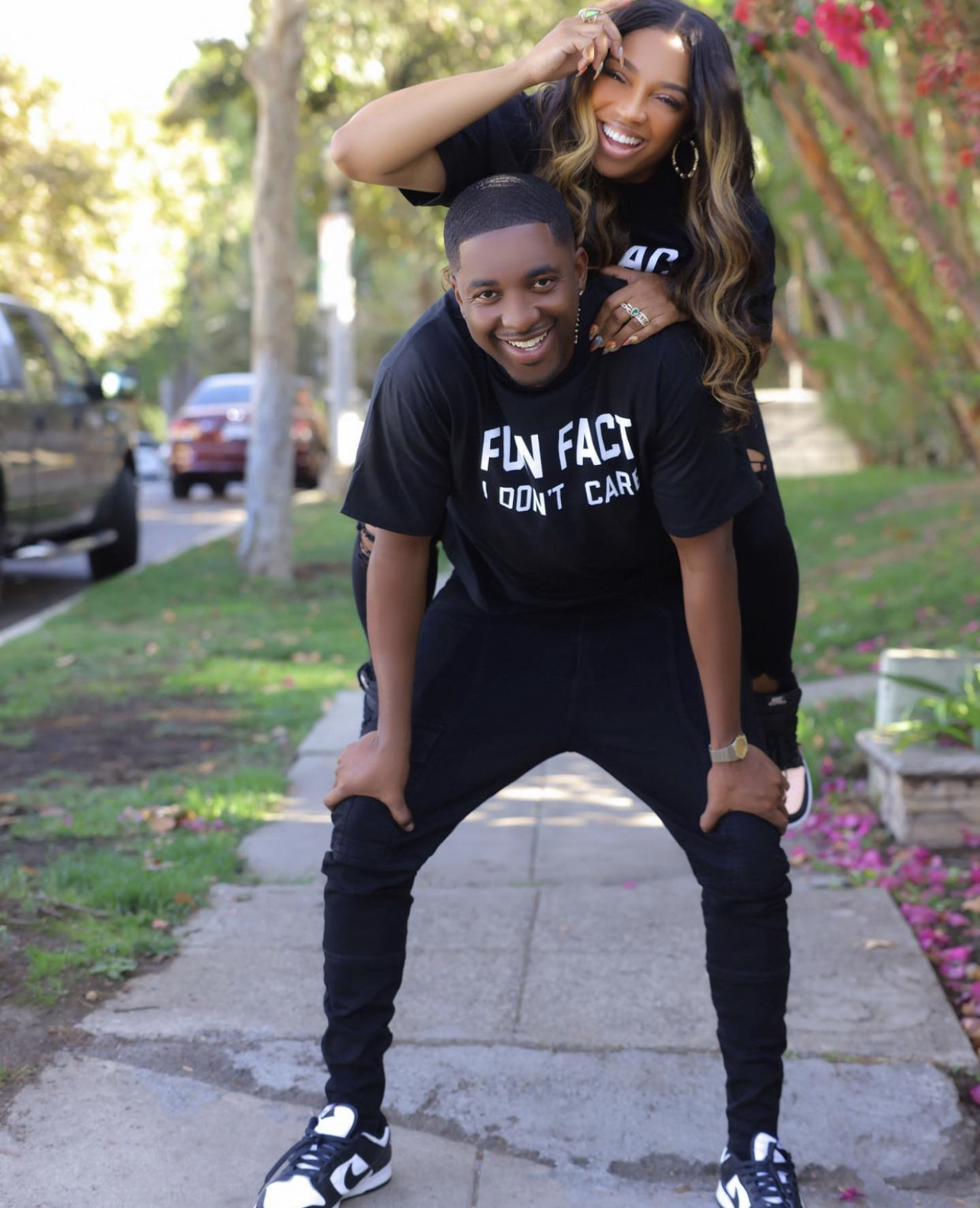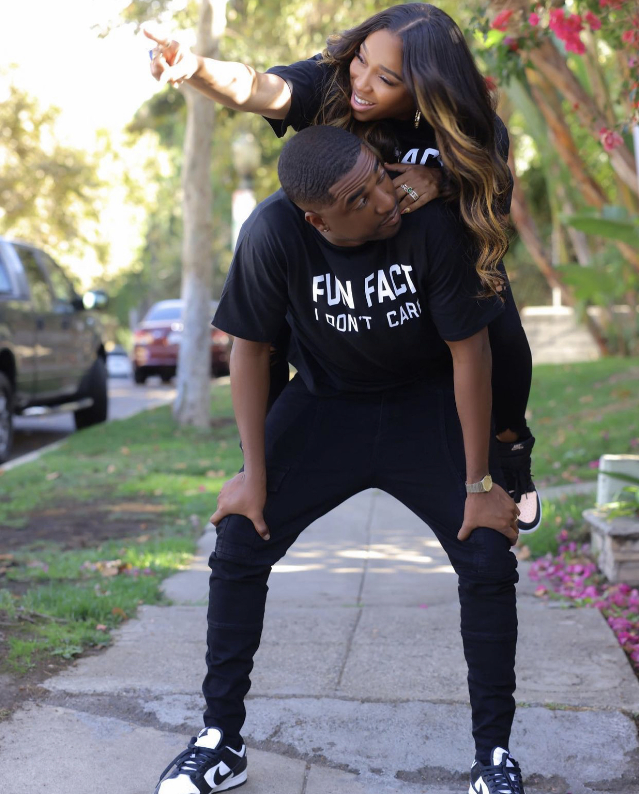 The Fashion Bomb couple was spotted in the $19.99 Fun Fact I Don’t Care Tee in black from Fashion Nova. Brooke paired her tee with distressed black jeans, gold hoop earrings, and Air Jordan sneakers with Marcus going for the same look in black denim trousers and Nike sneakers.