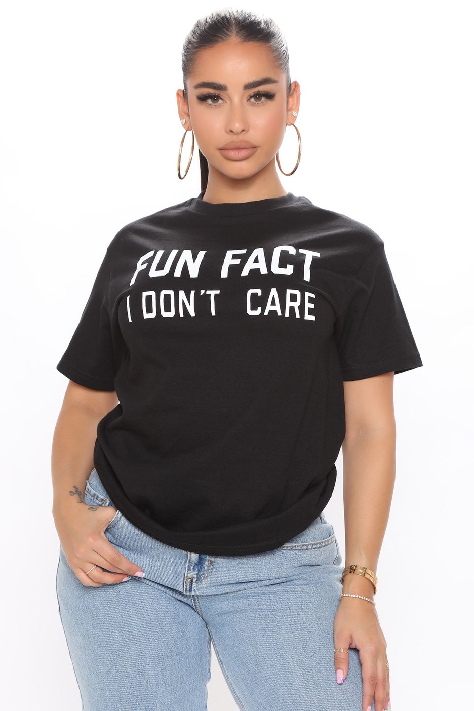 The Fun Fact I Don’t Care Tee appears in black with a crew neckline and short sleeves, reading “Fun Fact I Don’t Care” in a bold white font. What better way to show your unapologetic spirit than with this tee!