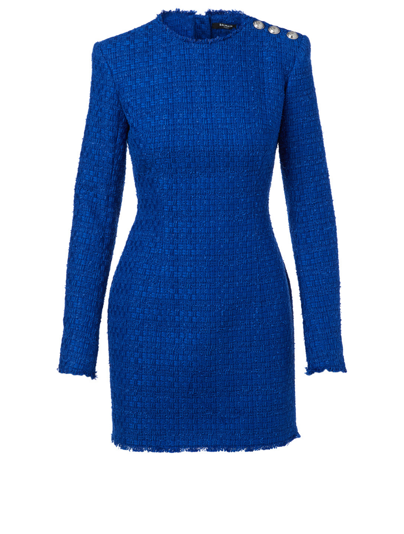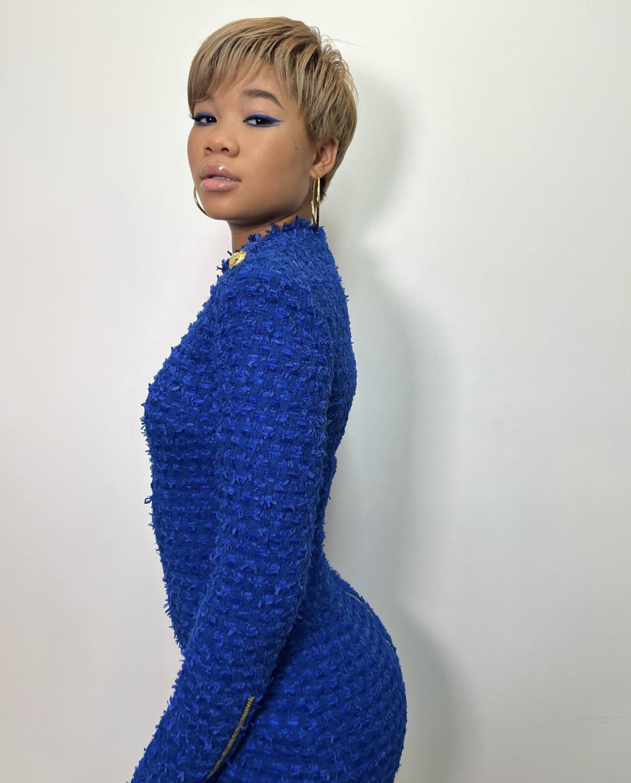 Storm Reid wore a $1,537 Balmain blue long sleeve frayed tweed dress in electric blue (sold out), styled by Jason Bolden. The stunning dress was paired with gold hoop earrings and spiral gold heels. She also sported her new blonde short cut to go along with the look.