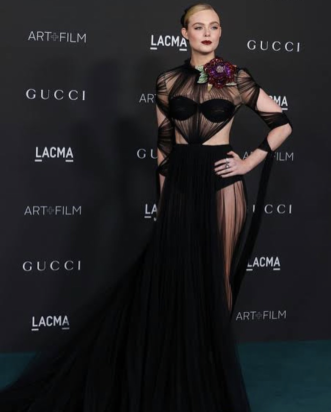 Elle Fanning wore a custom Gucci black sheer cutout gown with a crystal-embellished floral brooch to the 2021 LACMA Gala, styled by Samatha McMillen.