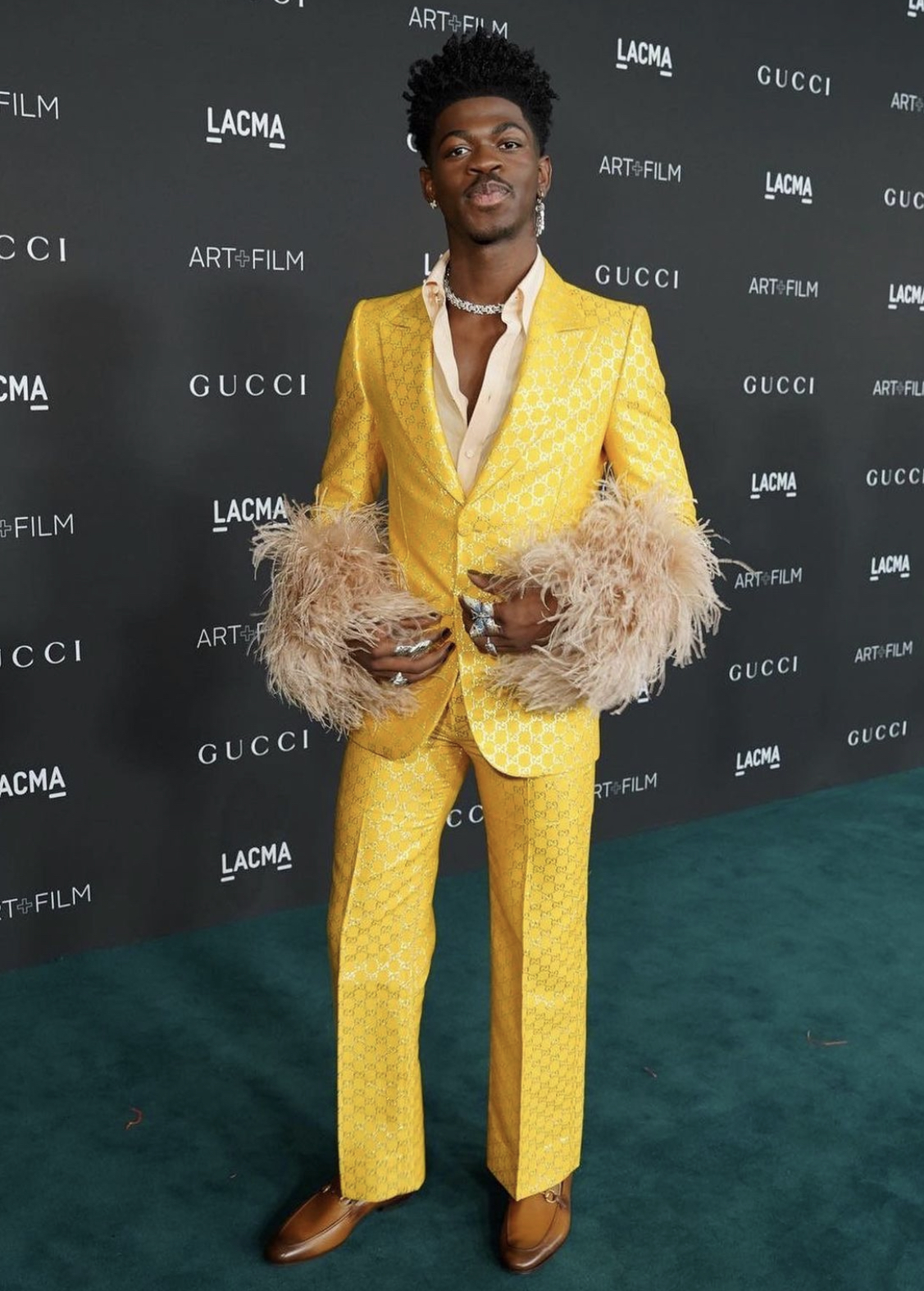 Lil Nas X wore a Gucci yellow monogram suit, styled by Hodo Musa.