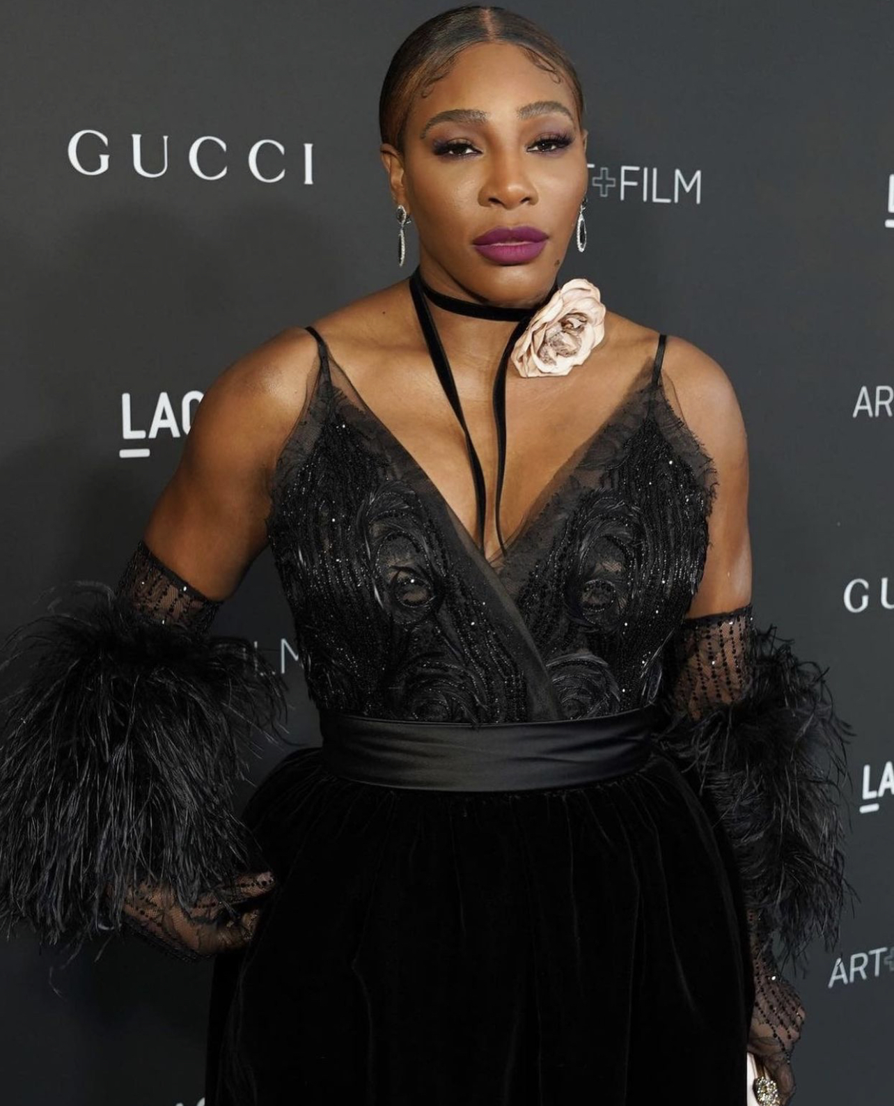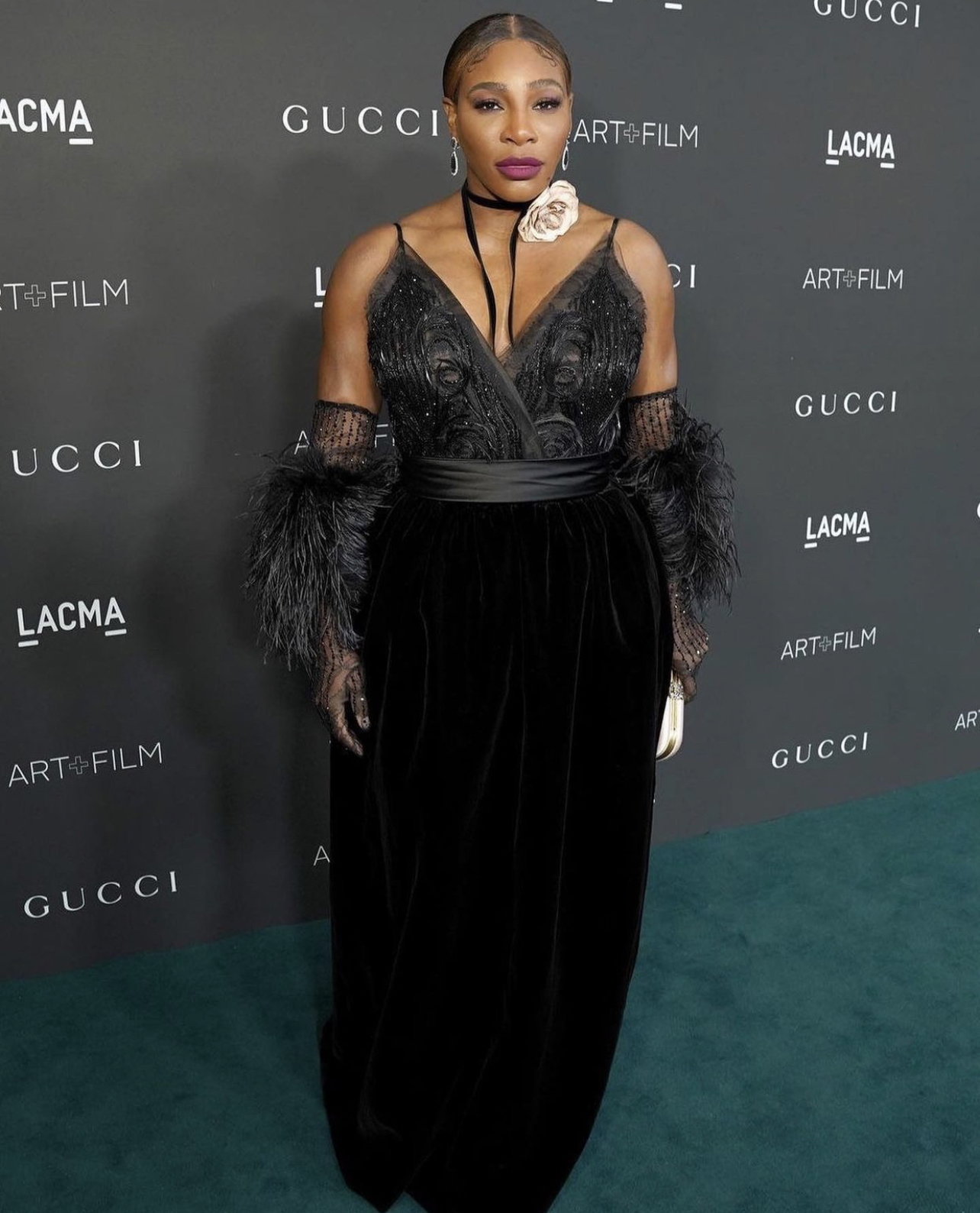Serena Williams wore a Gucci tank top and velvet skirt paired with feather-embellished lace gloves, styled by Kesha McLeod.