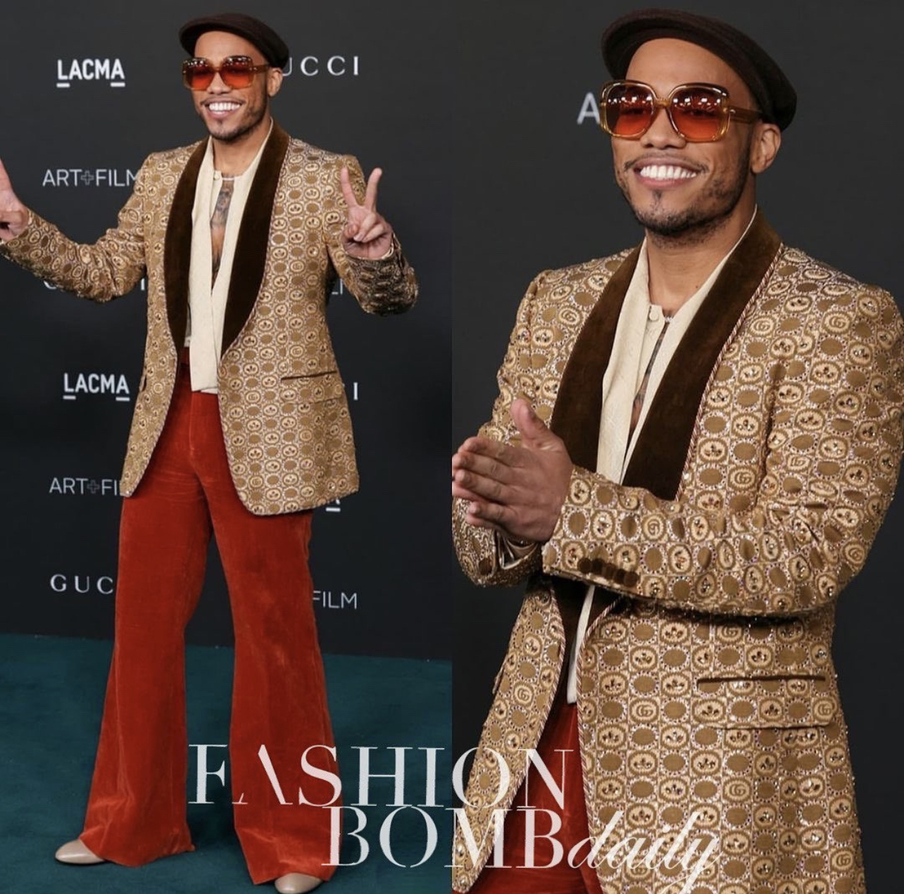 Anderson Paak wore a Gucci suit including an embellished suit jacket, cream shirt, and red velvet flare trousers.