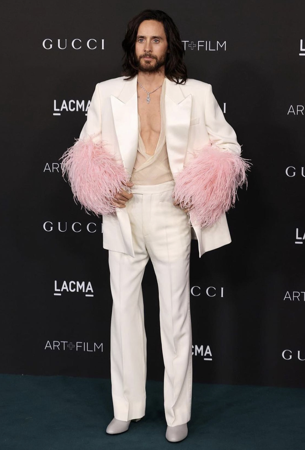 Jared Leto wore a Gucci pink feather-adorned white suit to the 2021 LACMA Gala.