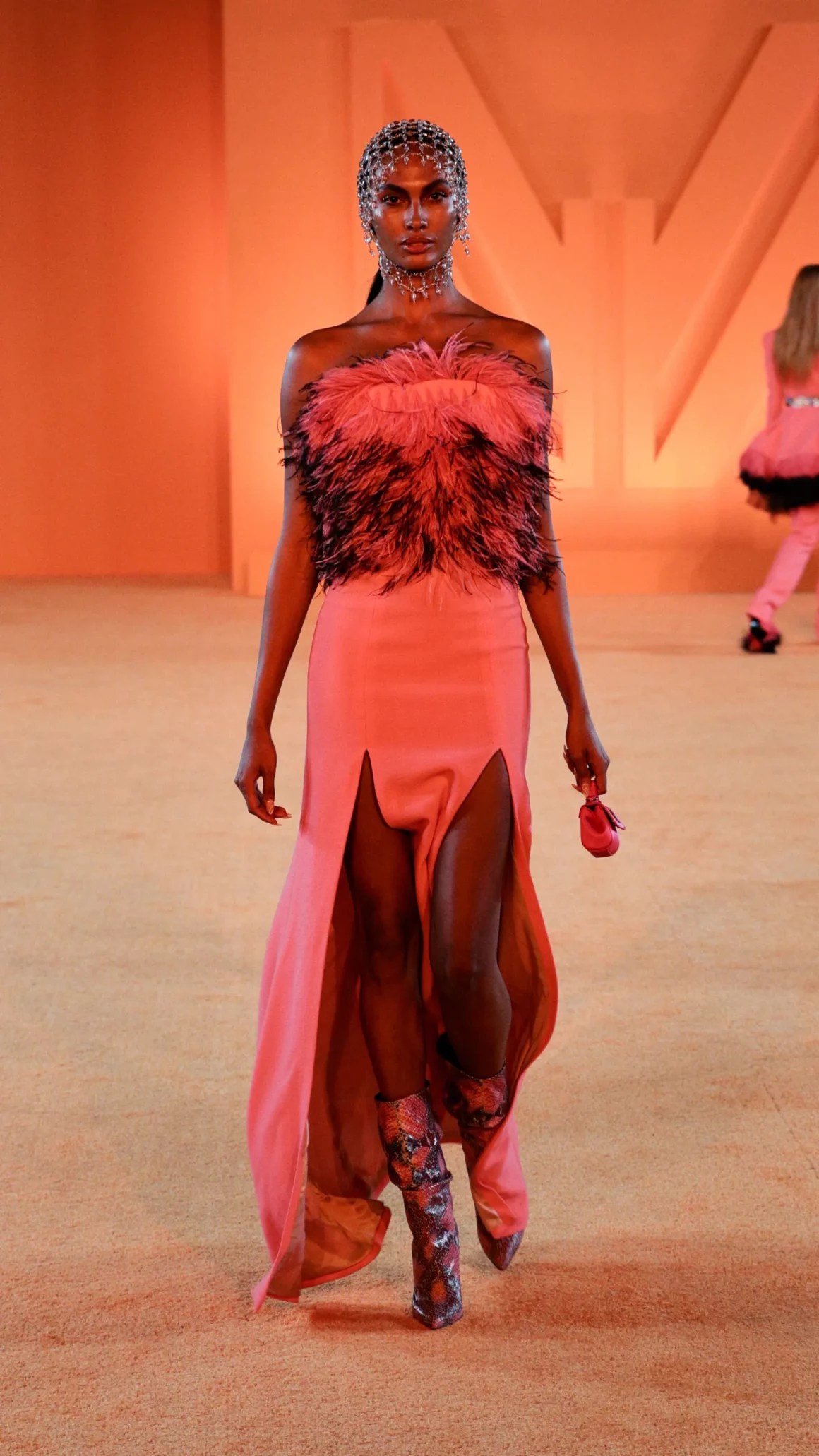 Bella Poarch wore Marcell Von Berlin Spring/Summer 2022 feather-trimmed dress and fringe over-knee, styled by Nikko Panti.