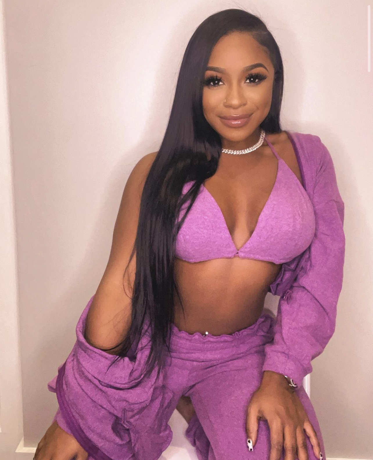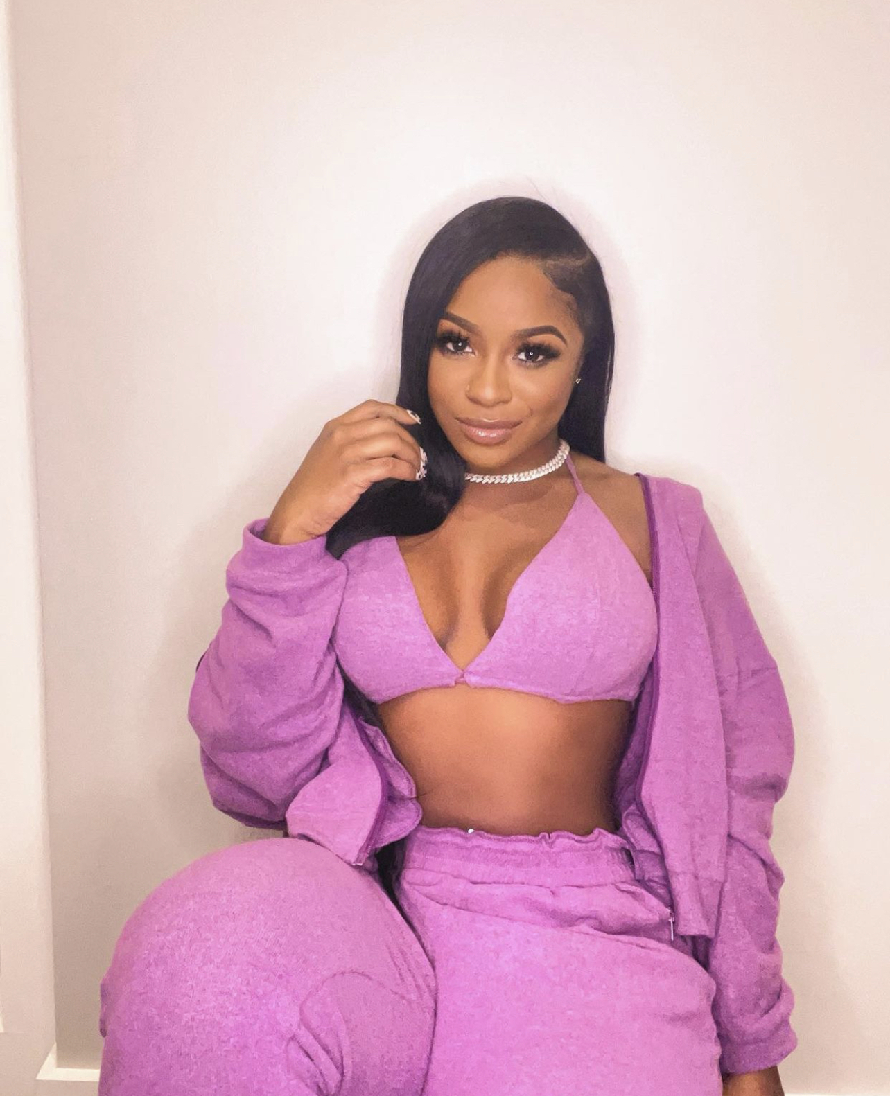 Reginae Carter wore Fashion Nova’s $74.99 Never Wanna Leave 3 Piece Jogger Set in purple. The set features a triangle bralette top, full-zip jacket, and high-waisted joggers, all of which appear in a comfortable fabric with stretch.