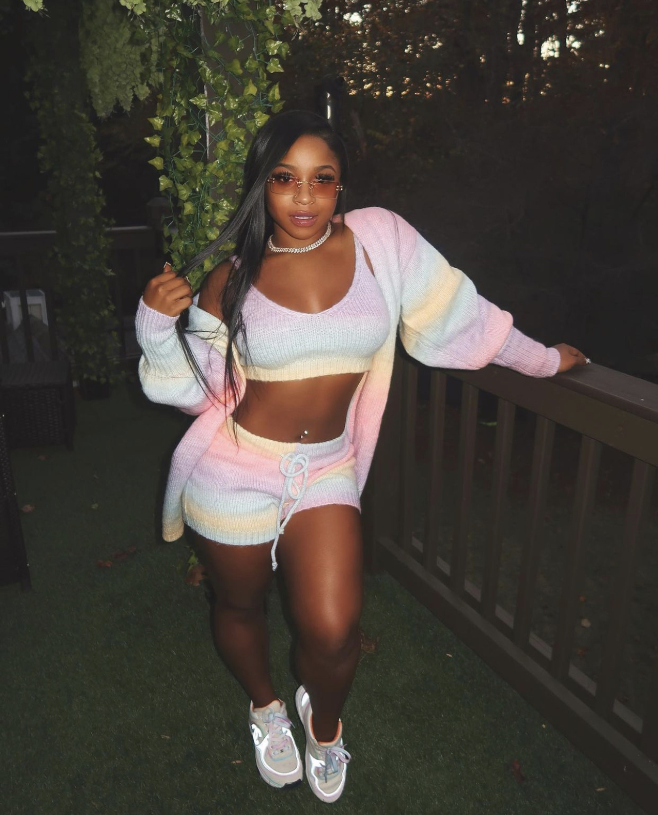 Reginae Carter wore Fashion Nova’s $69.99 Cotton Candy 3 Piece Sweater Short Set in multicolor. The set features a cropped sleeveless top, long cardigan, and high-waisted shorts in a knit sweater material.