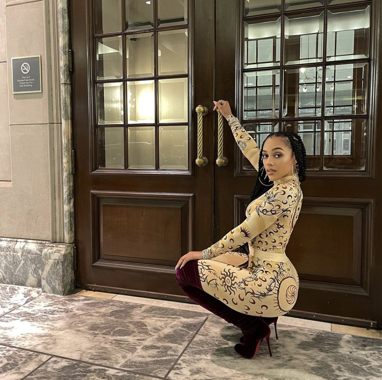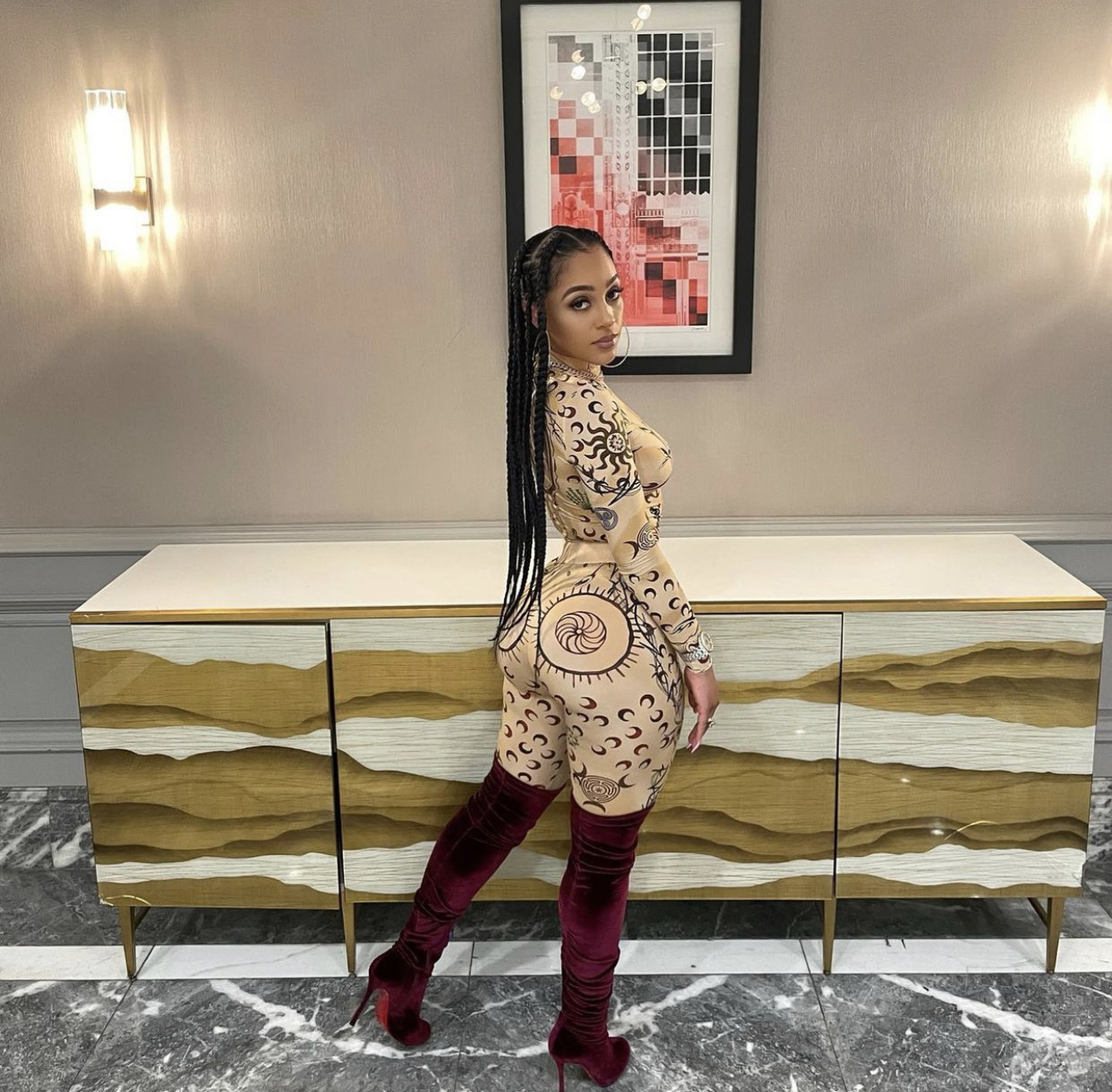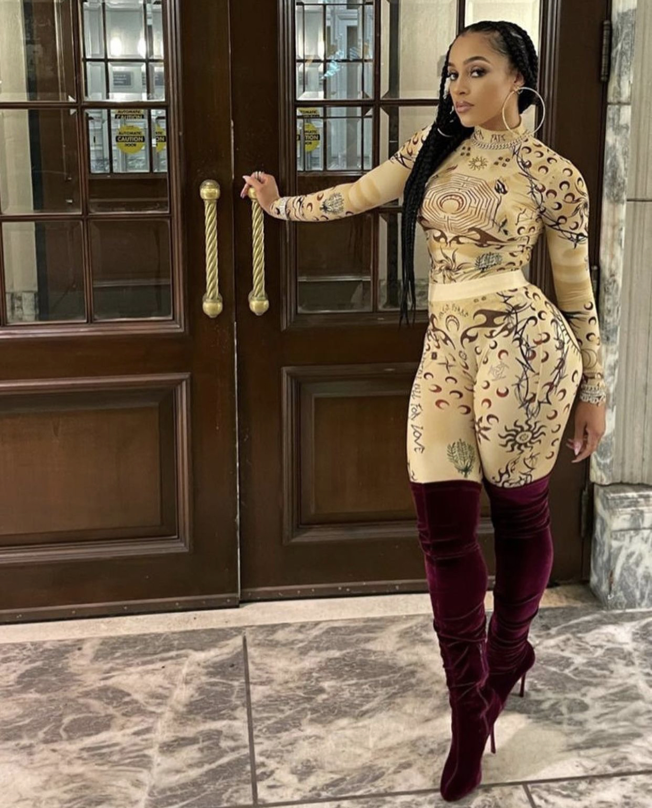 Joie Chavis recently stepped out for a night out rocking a physique-loving nude tattoo print ensemble and burgundy velvet thigh-high boots.