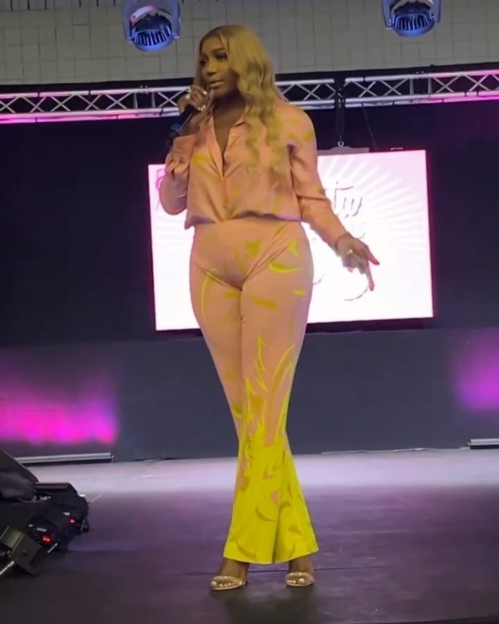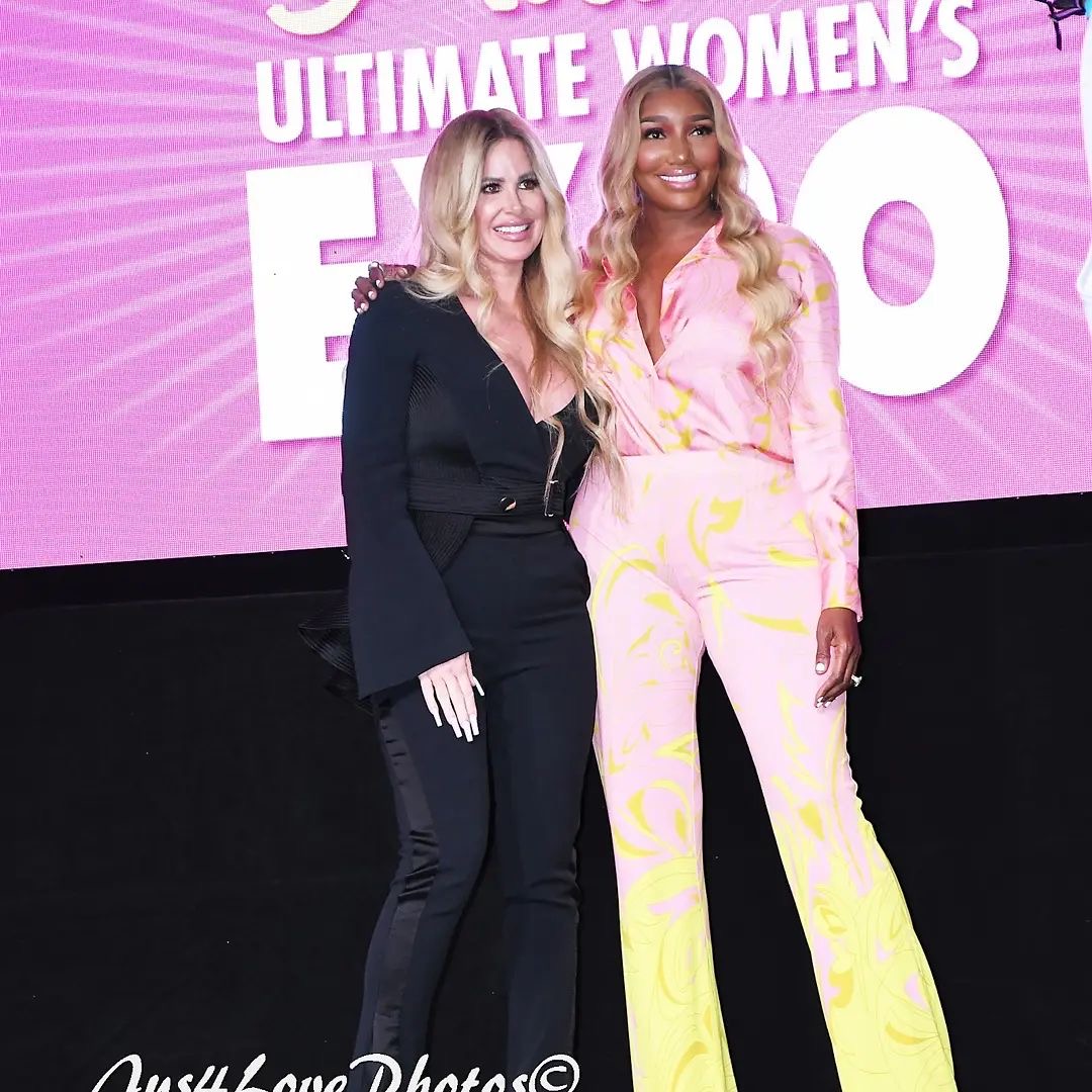 Nene Leakes reunited with former Real Housewives castmate Kim Zolciak -Biermann at the Ultimate Women’s Expo wearing an Emilio Pucci look including the Dinamica pink and yellow blouse and $924 matching trousers.