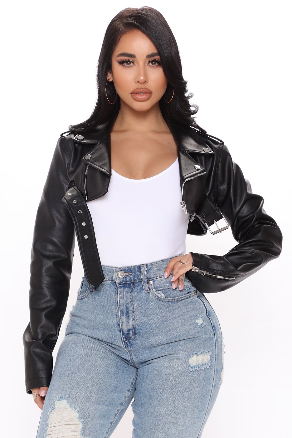 Bernice Burgos wore Fashion Nova’s $39.99 Pop It Crop It Faux Leather Jacket in black. The moto-style jacket appears in a super cropped design matched with all the details of a classic leather jacket like the buckle belt, zippers, and collar. While Bernice rocks the black colorway, the jacket also comes in white, with sizing ranging up to 3X.