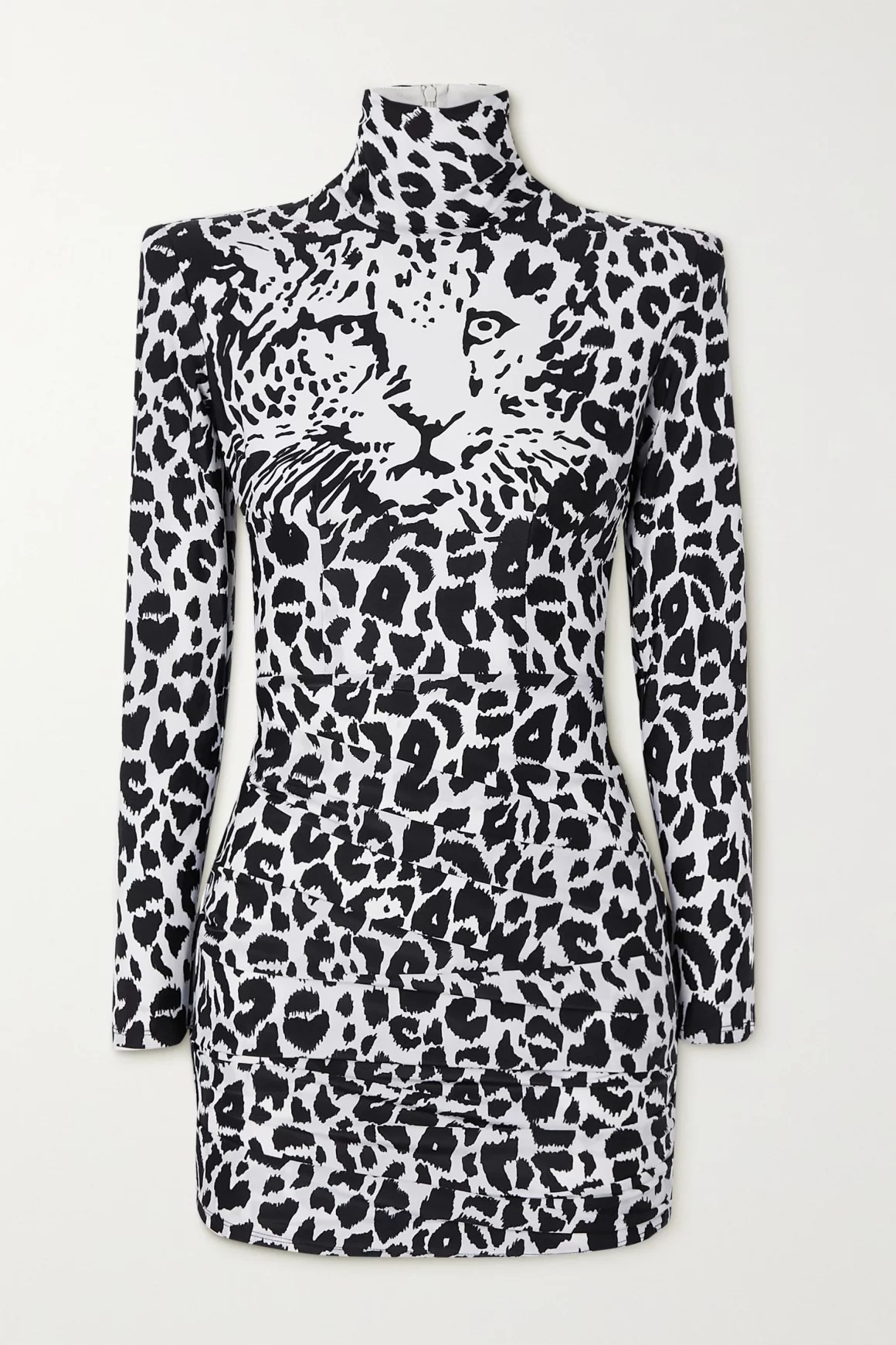 Nicki Minaj smiled and posed with her little one wearing a $1,100 Alex Perry Ryan leopard-print stretch-jersey turtleneck mini dress (sold out) paired with red satin sock ankle boots.