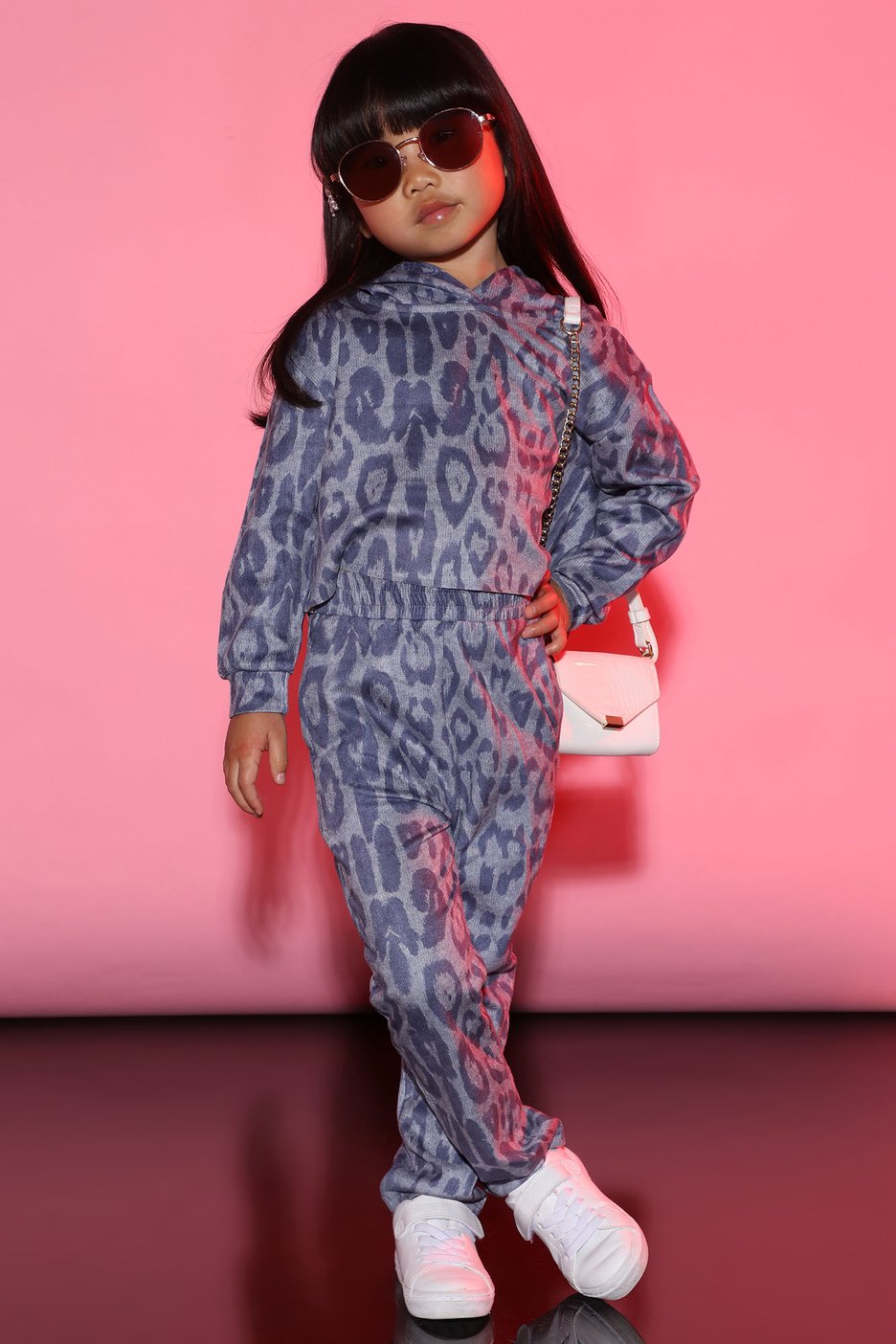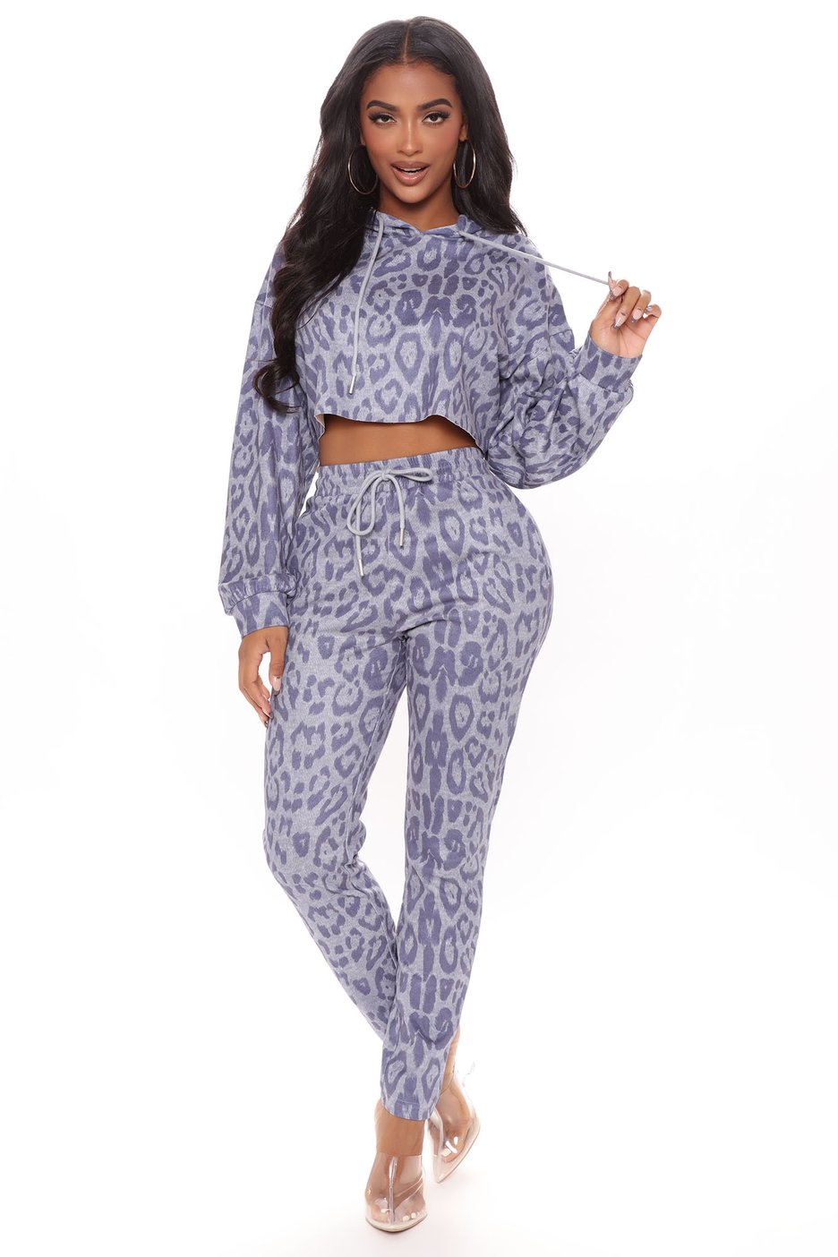 Erica Mena wore Fashion Nova’s $54.99 Back On The Prowl Leopard Suede Jogger Set in blue. The set includes a cropped hoodie with a raw-cut hem and high-waisted jogger pants with a drawstring waistband, with both appearing in a blue leopard design.
