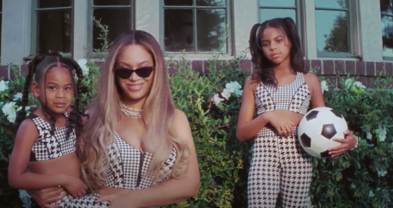 In a frame from the video, Queen Bey was spotted holding Rumi Carter with Blue Ivy playing with a soccer ball beside them. The ladies all donned matching houndstooth tops and leggings from the “Halls of Ivy” collection, making for a bomb mother-daughters style moment.