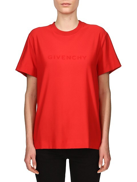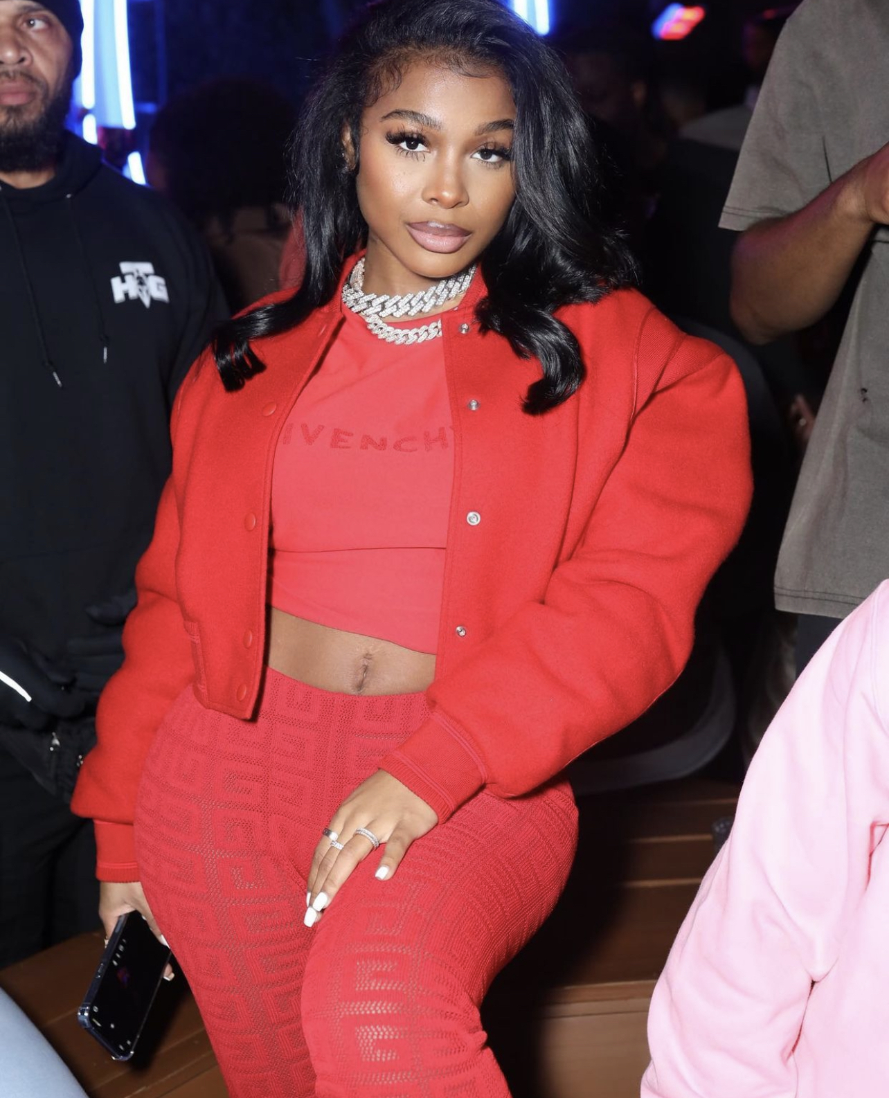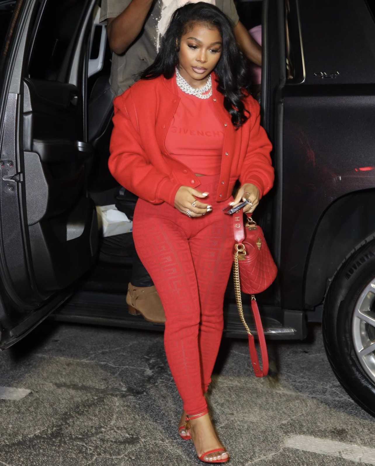 Jayda Cheaves wore a full Givenchy look including the $1,550 cropped paneled wool bomber jacket (sold out), $790 jacquard logo oversized t-shirt, and $1,085 legging pants in 4G jacquard. Continuing the red aesthetic of the look, she carried a red quilted Chanel handbag and sported $1,150 Tom Ford Padlock sandals in red (sold out).