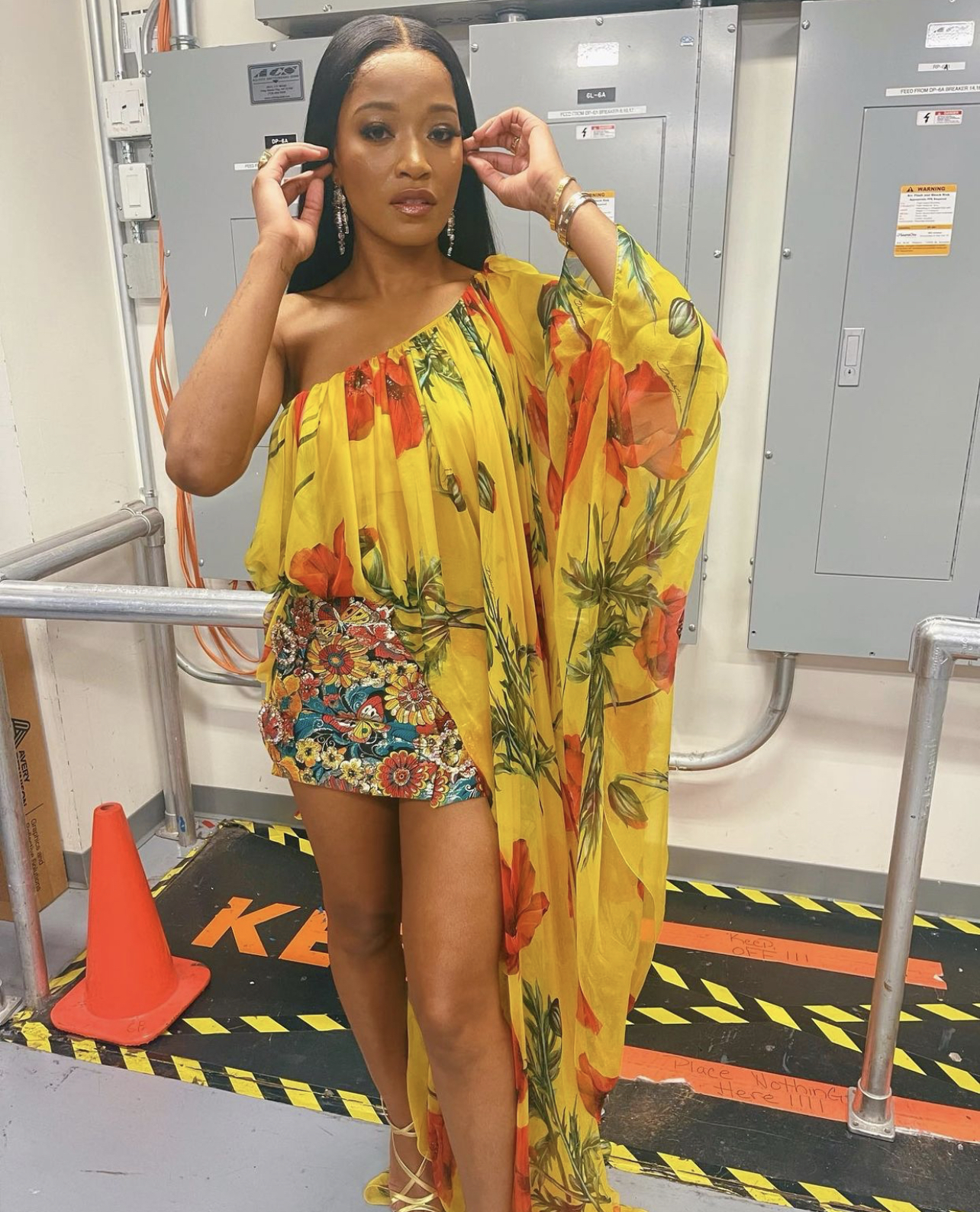 Keke Palmer wore a Dolce and Gabbana look including a yellow floral print one-shoulder maxi top and floral print crystal-buckle jacquard mini skirt. The look was complete with gold strappy heels and drop earrings. Her ensemble was styled by Seth Chernoff.