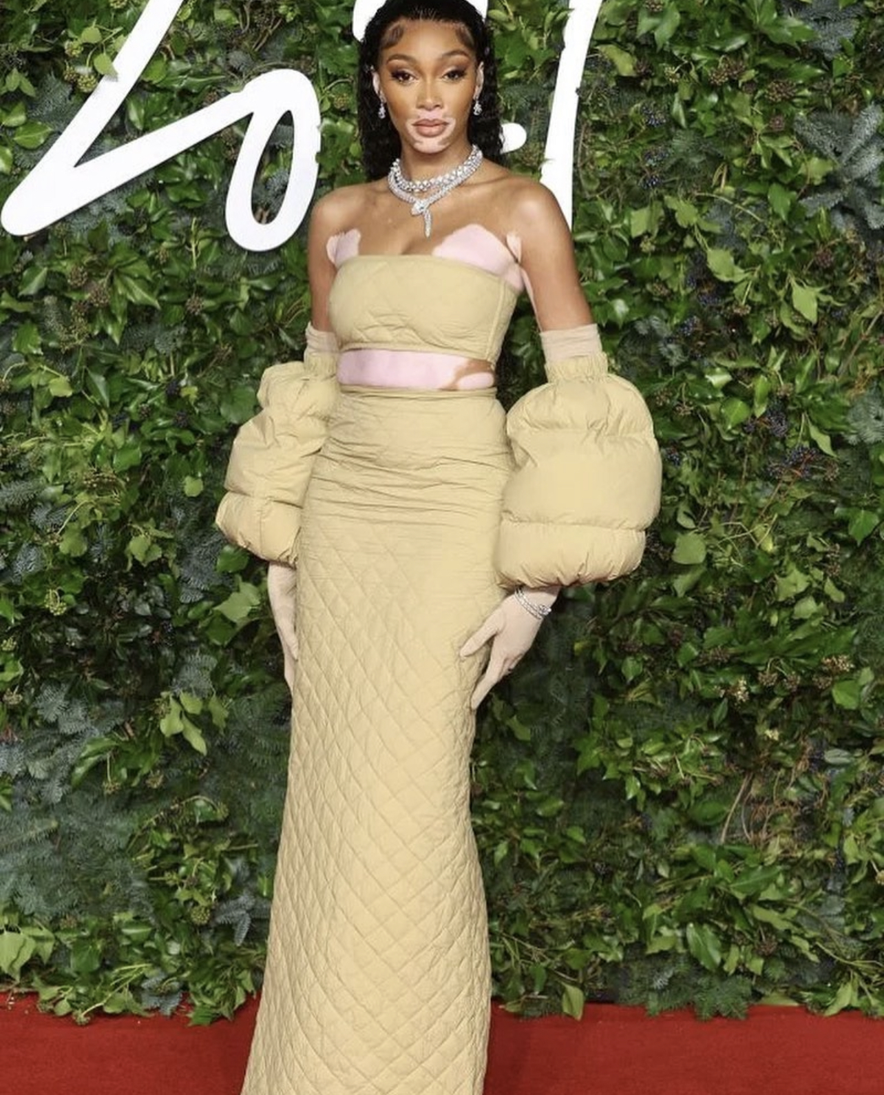Winnie Harlow wore a custom Moncler quilted two-piece ensemble with puffer sleeves.