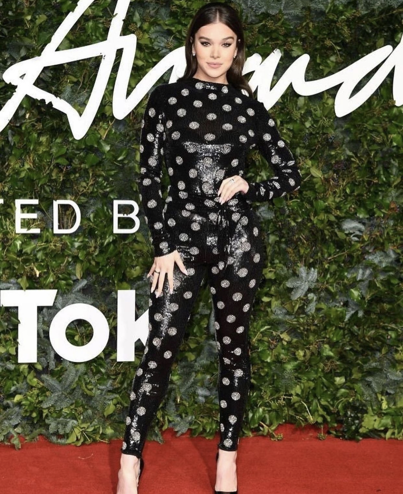 Hailee Steinfeld wore an H&M sequin polka dot jumpsuit, styled by Jason Rembert.