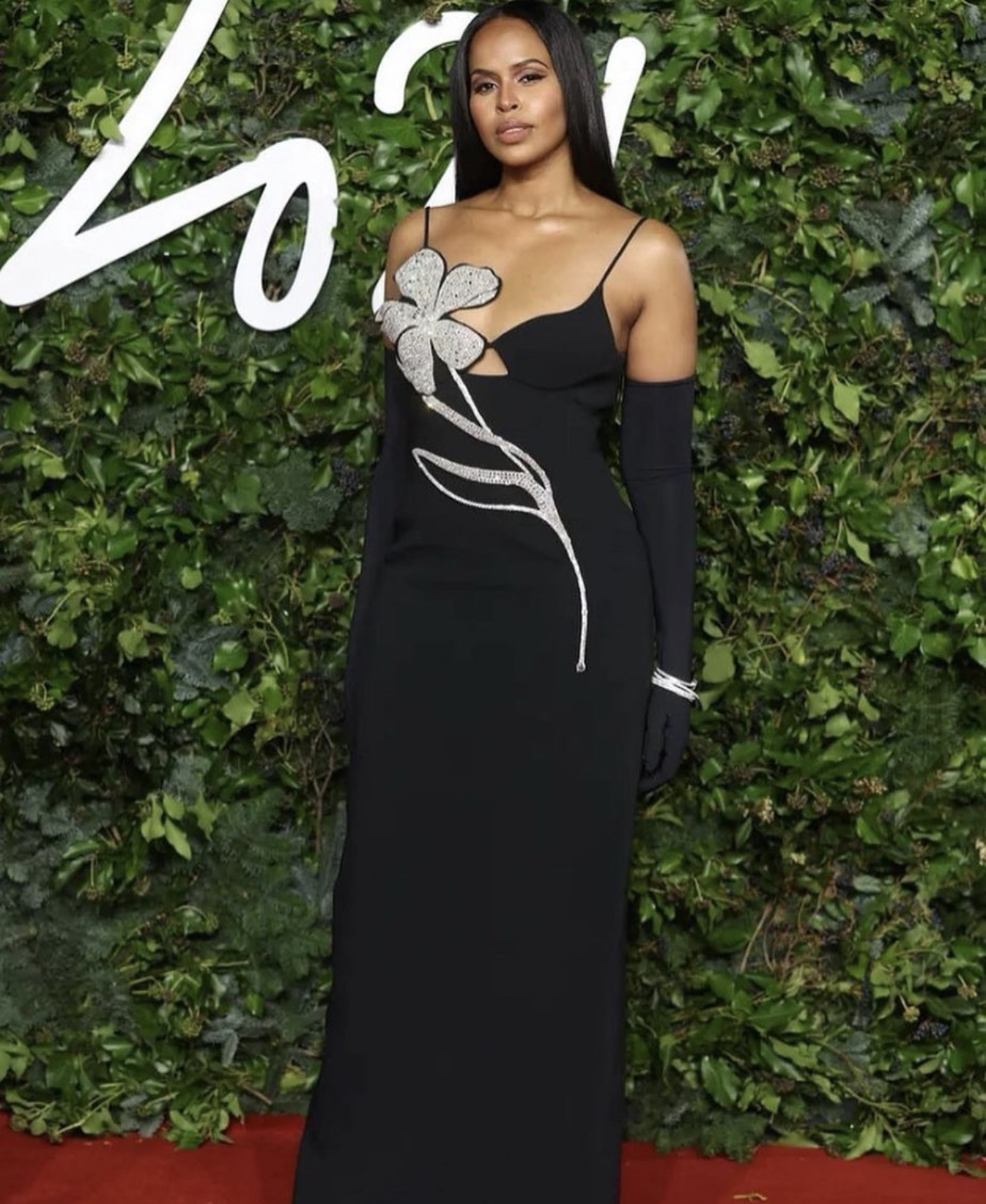 Jourdan Dunn wore an Andrea Brocca red spiral rose gown paired with Louboutin red pumps and Tiffany & Co. jewelry, styled by Justin Hamilton.