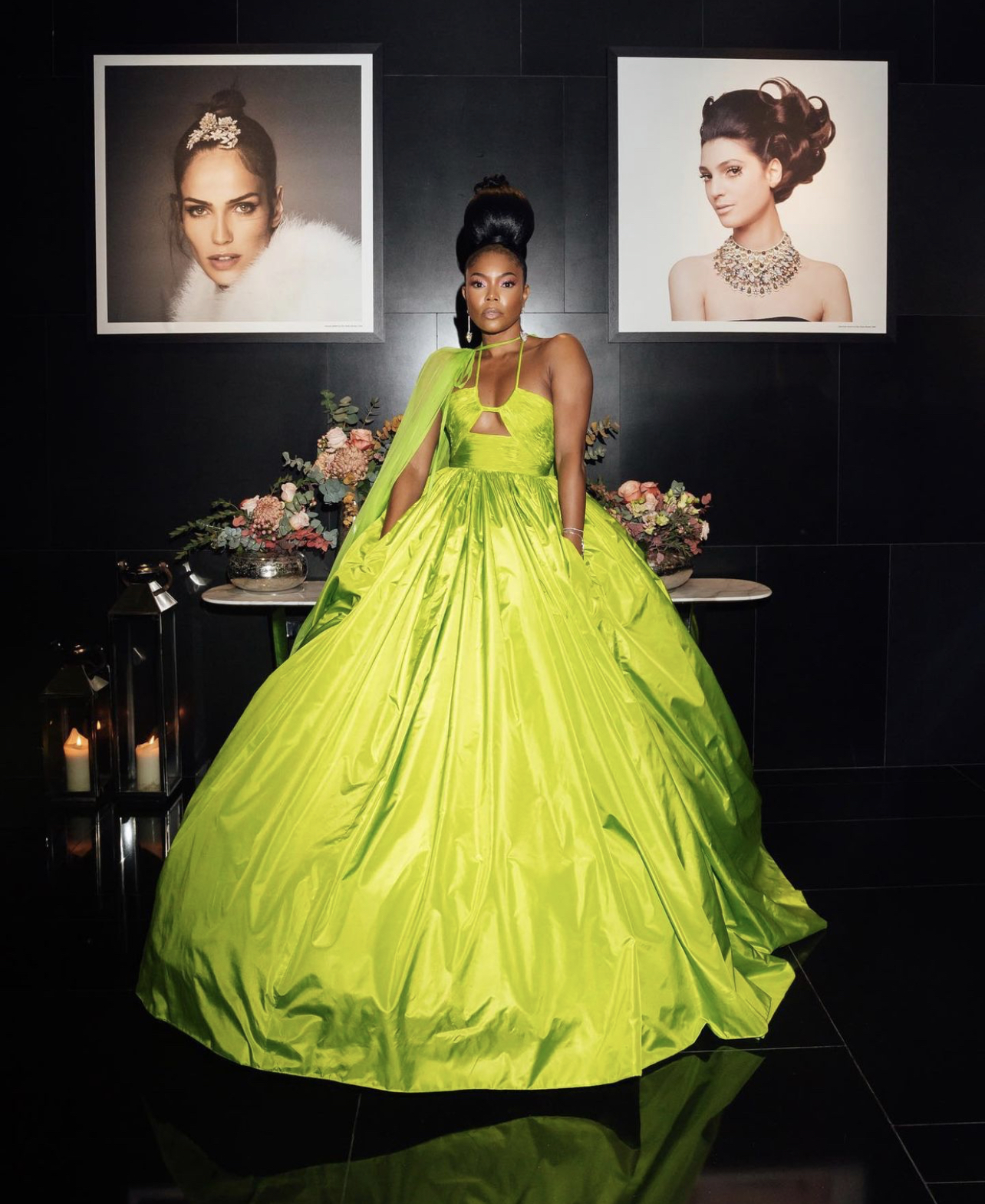 Gabrielle Union wore a neon green Valentino gown and chiffon cape, styled by Thomas Christos.