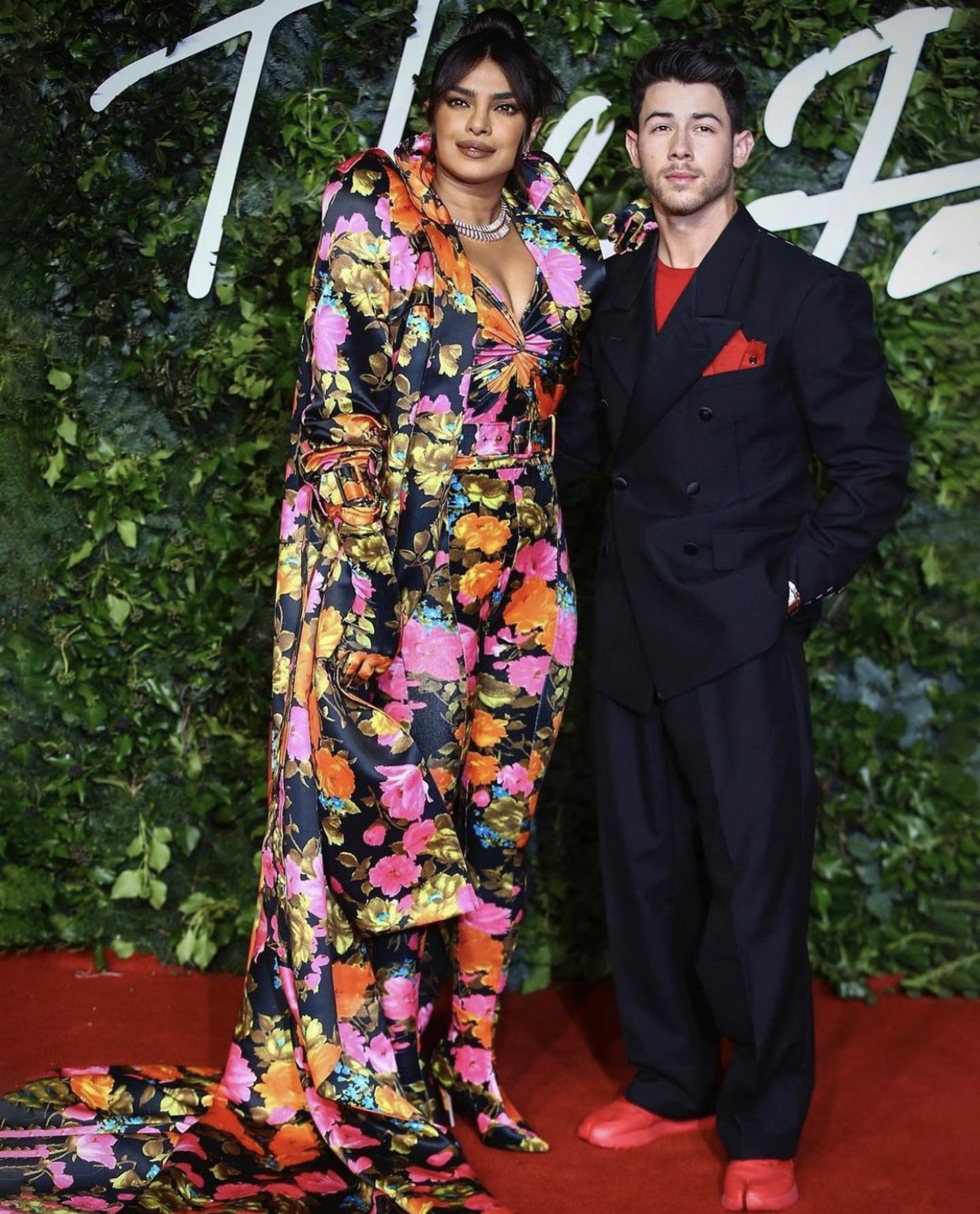 Priyanka Chopra wore custom Richard Quinn, inspired by a Fall 2021 look and styled by Law Roach. She attended the award ceremony with husband Nick Jonas who wore Maison Margiela.