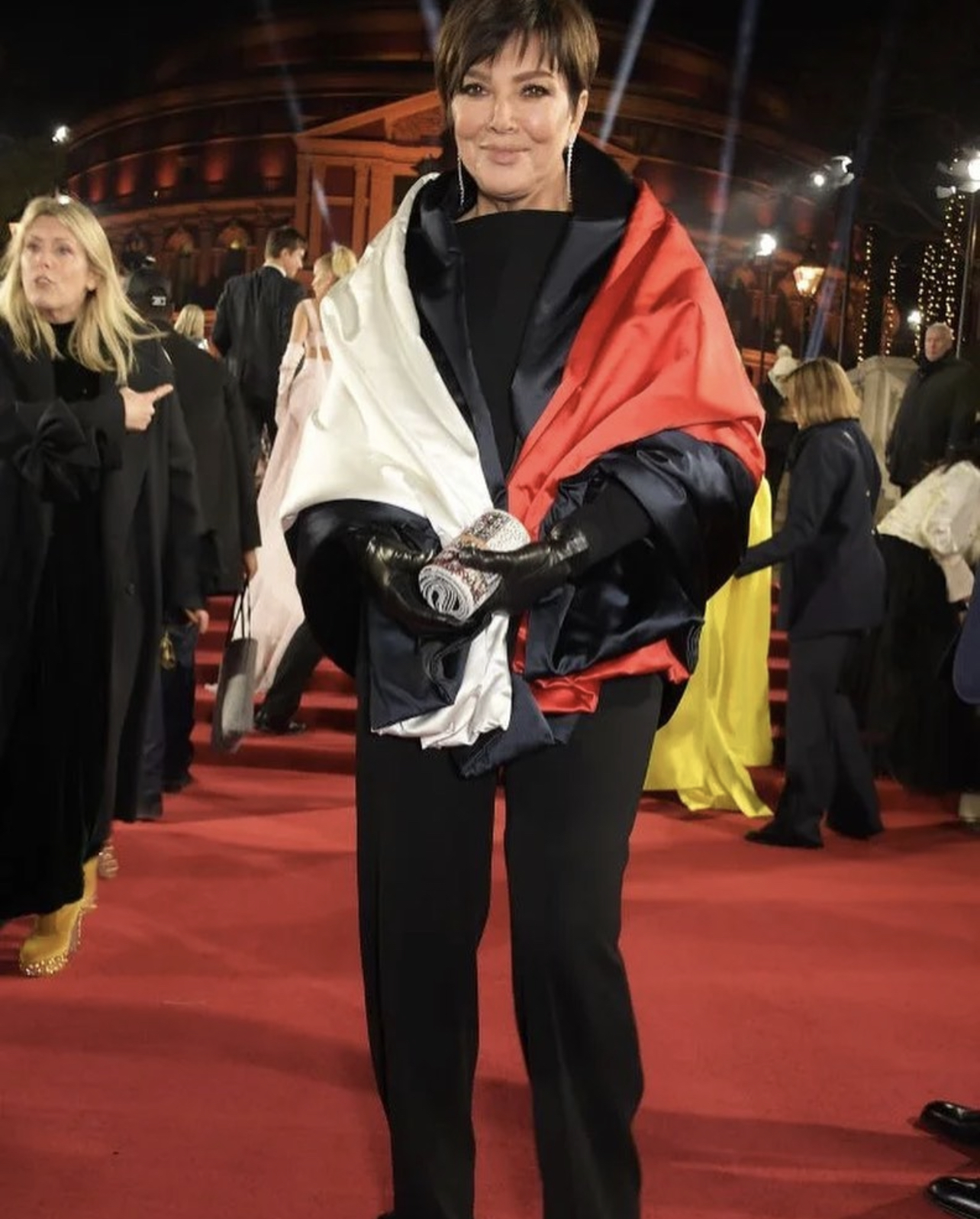 Kris Jenner wore Tommy Hilfiger including a black, white and blue shawl and black jumpsuit.