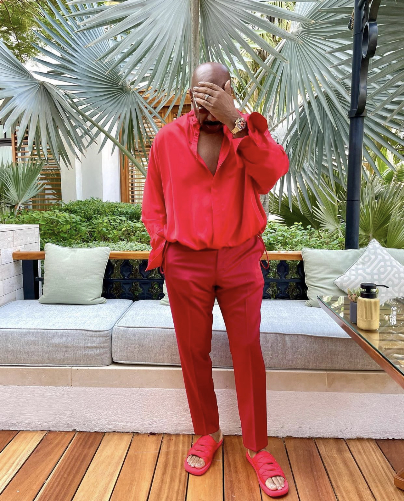 The look was completed with red slide sandals and gold sunglasses.