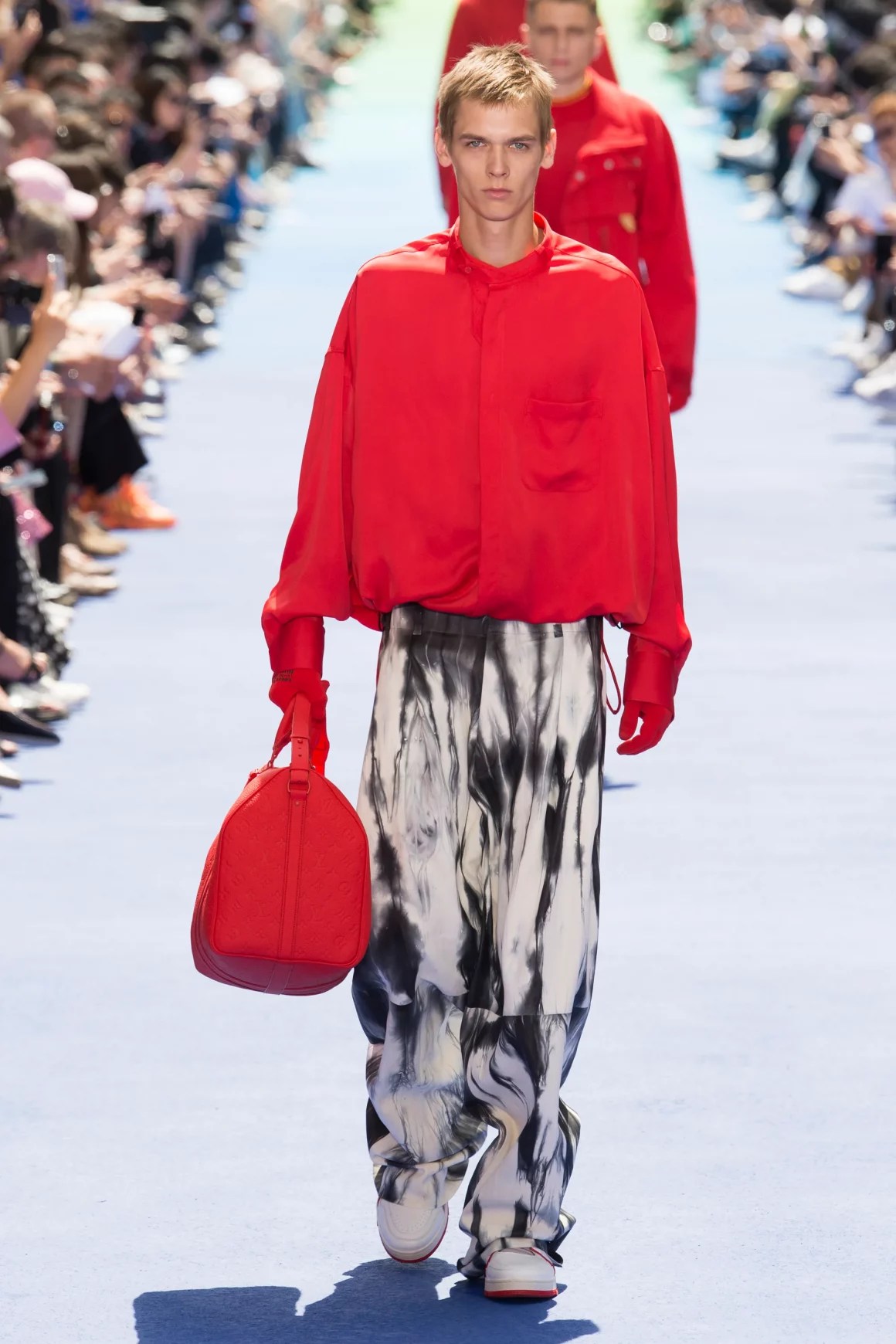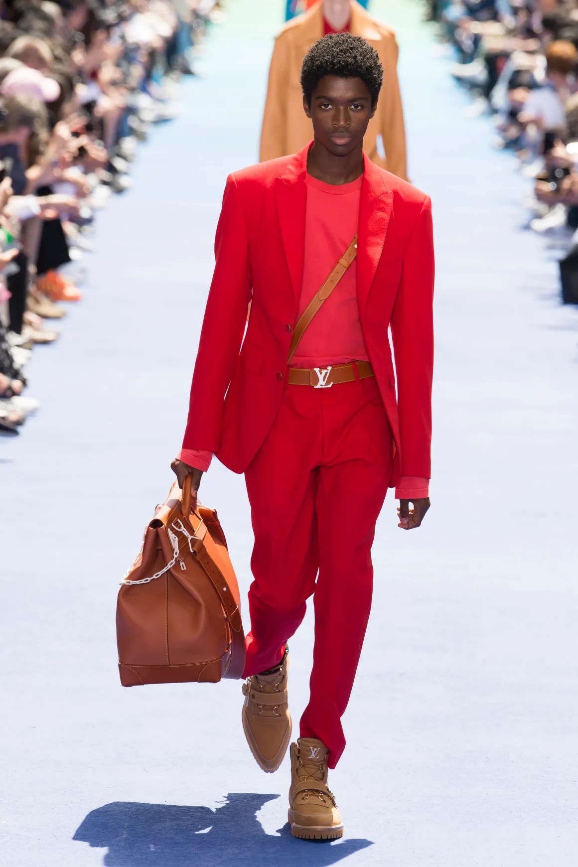 Steve Harvey wore a Louis Vuitton Spring 2019 red shirt and trousers, styled by Elly Karamoh. Karamoh pulled this look together with the intention of honoring the late designer Virgil Abloh. This look worn by Harvey comes from the Spring/Summer 2019 collection which was his first collection and show as Louis Vuitton’s creative director for its menswear line. Karamoh expressed in an Instagram post, “The Spring 2019 Louis Vuitton collection was the start of a new generation coming into its own. RIP Virgil Abloh.“