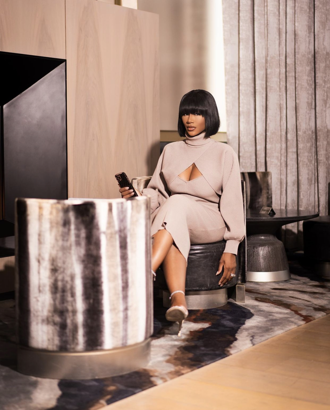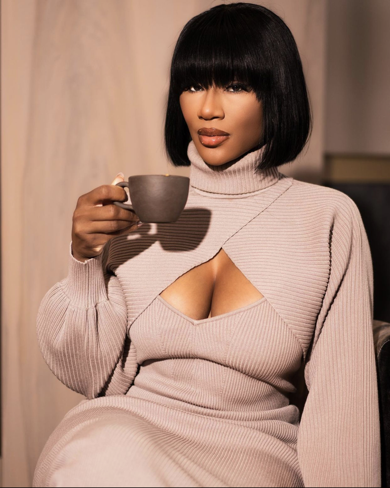 Award-winning real estate broker and star of OWN’s newest reality tv show, Ladies Who List: Atlanta, Quiana Watson was spotted enjoying a day at work wearing a bomb look. She was outfitted in a $498 Ronny Kobo “Lalu” ribbed dress in oatmeal.